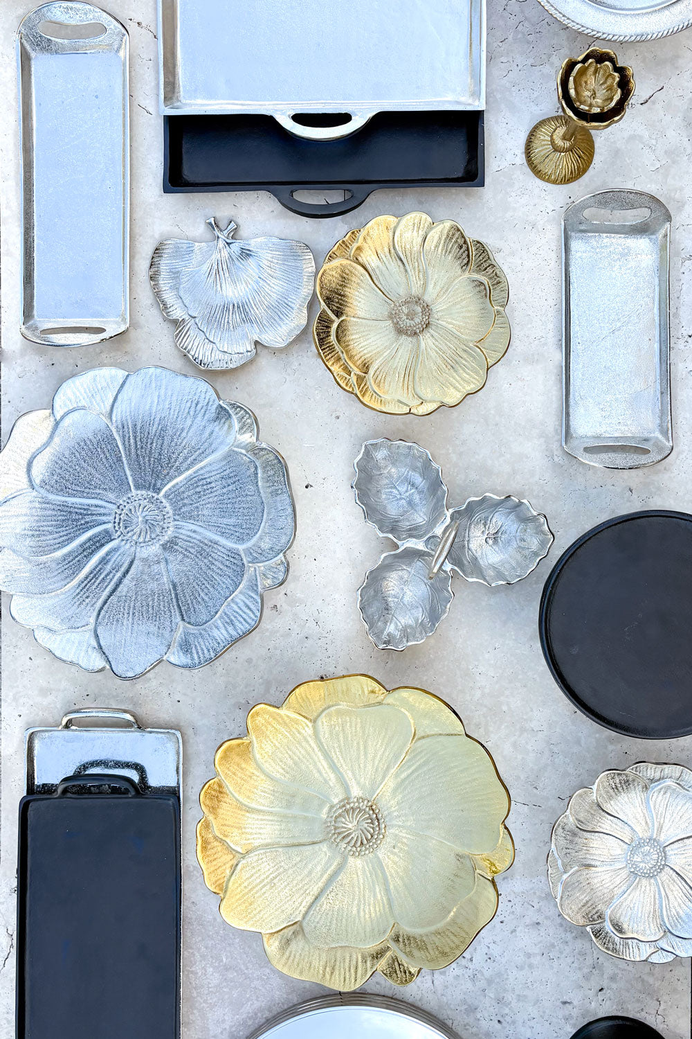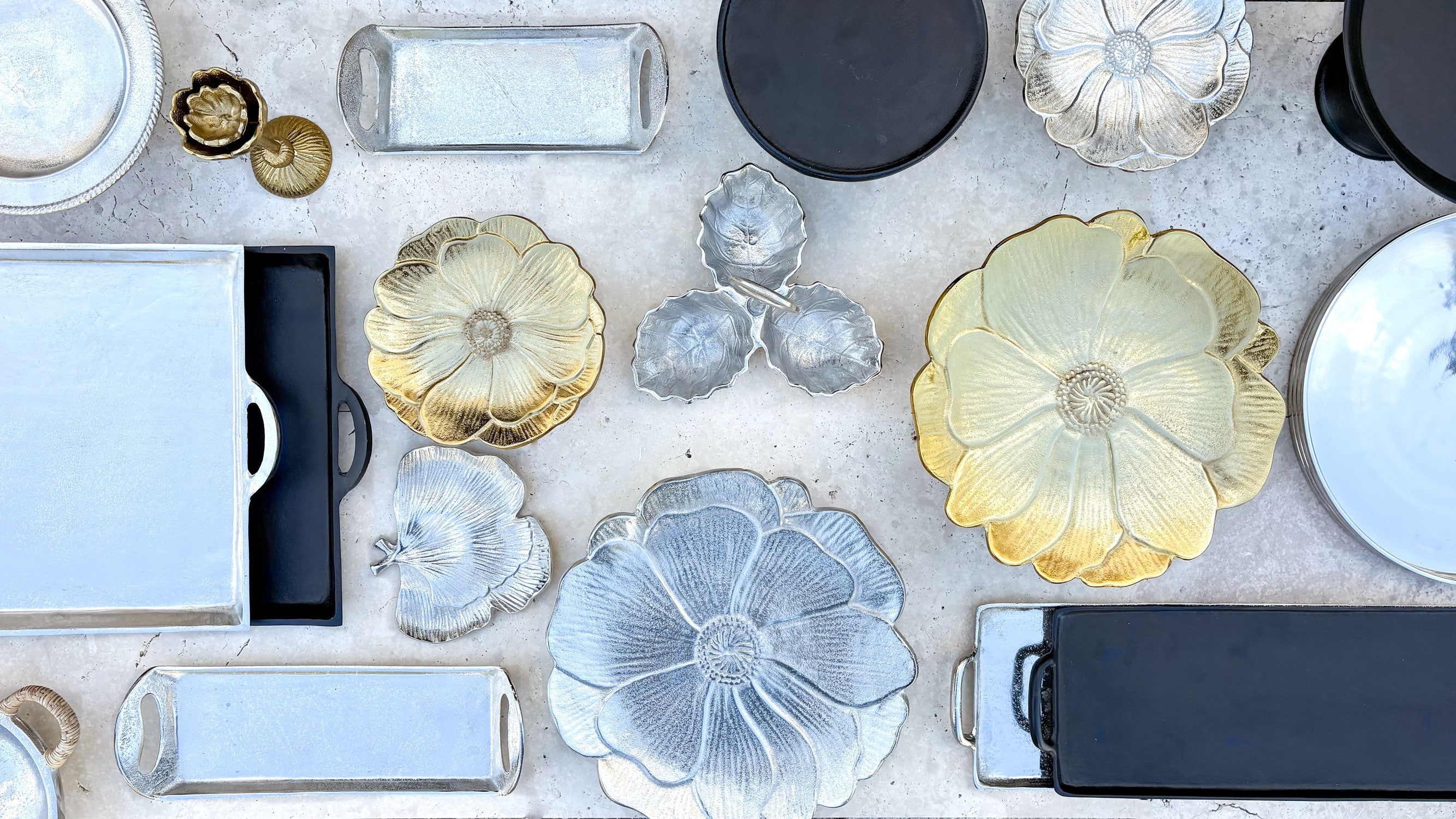 Piezas en dorado, plateado y negro para decorar o servir con estilo