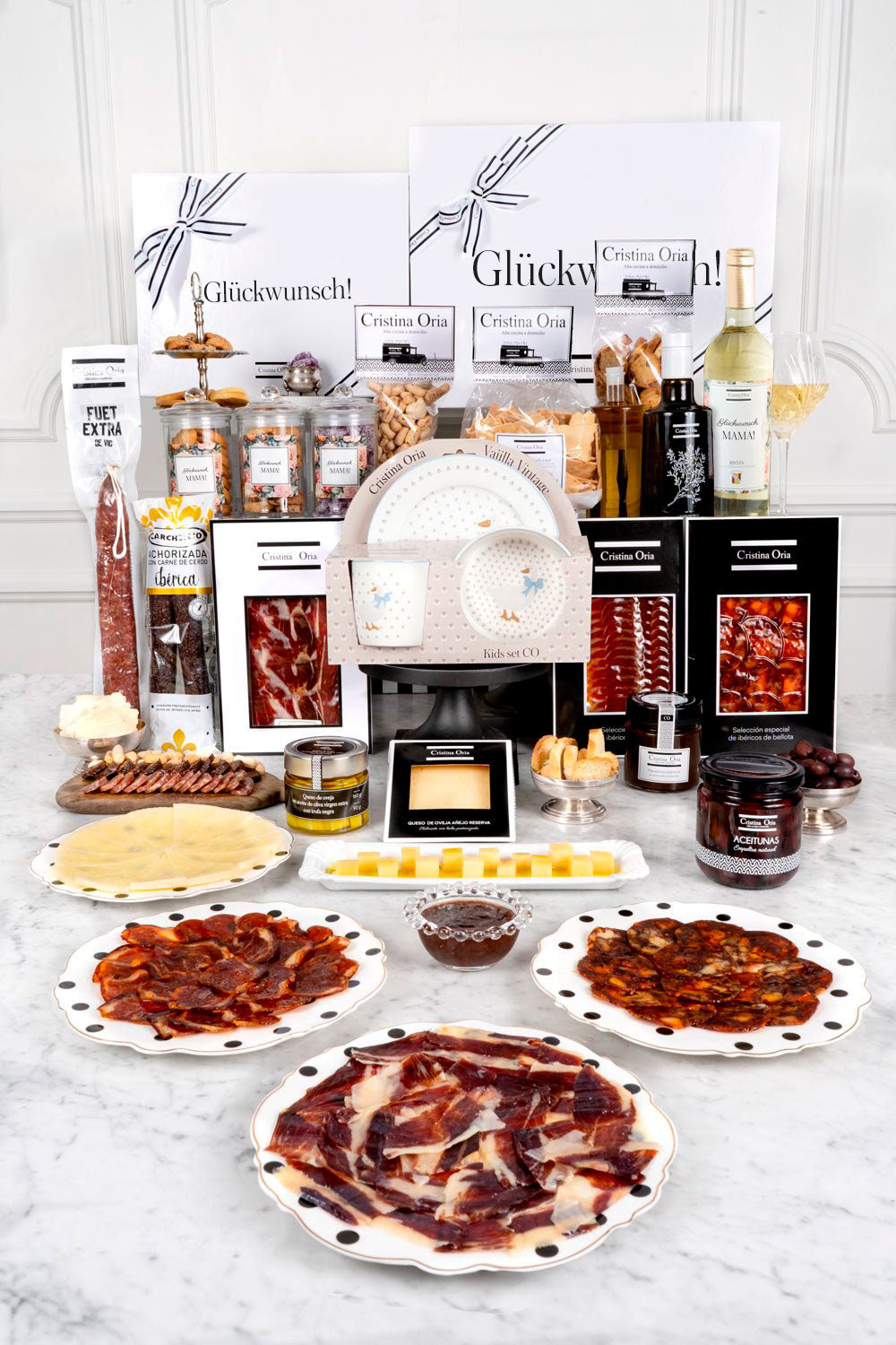 Diese Box ist eine unserer umfassendsten Optionen für junge Mütter, da sie neben unserem Geschirr (zur Auswahl) mit Cristina Orias eigenem Design für das Neugeborene eine große Auswahl unserer besten Gourmetprodukte enthält.