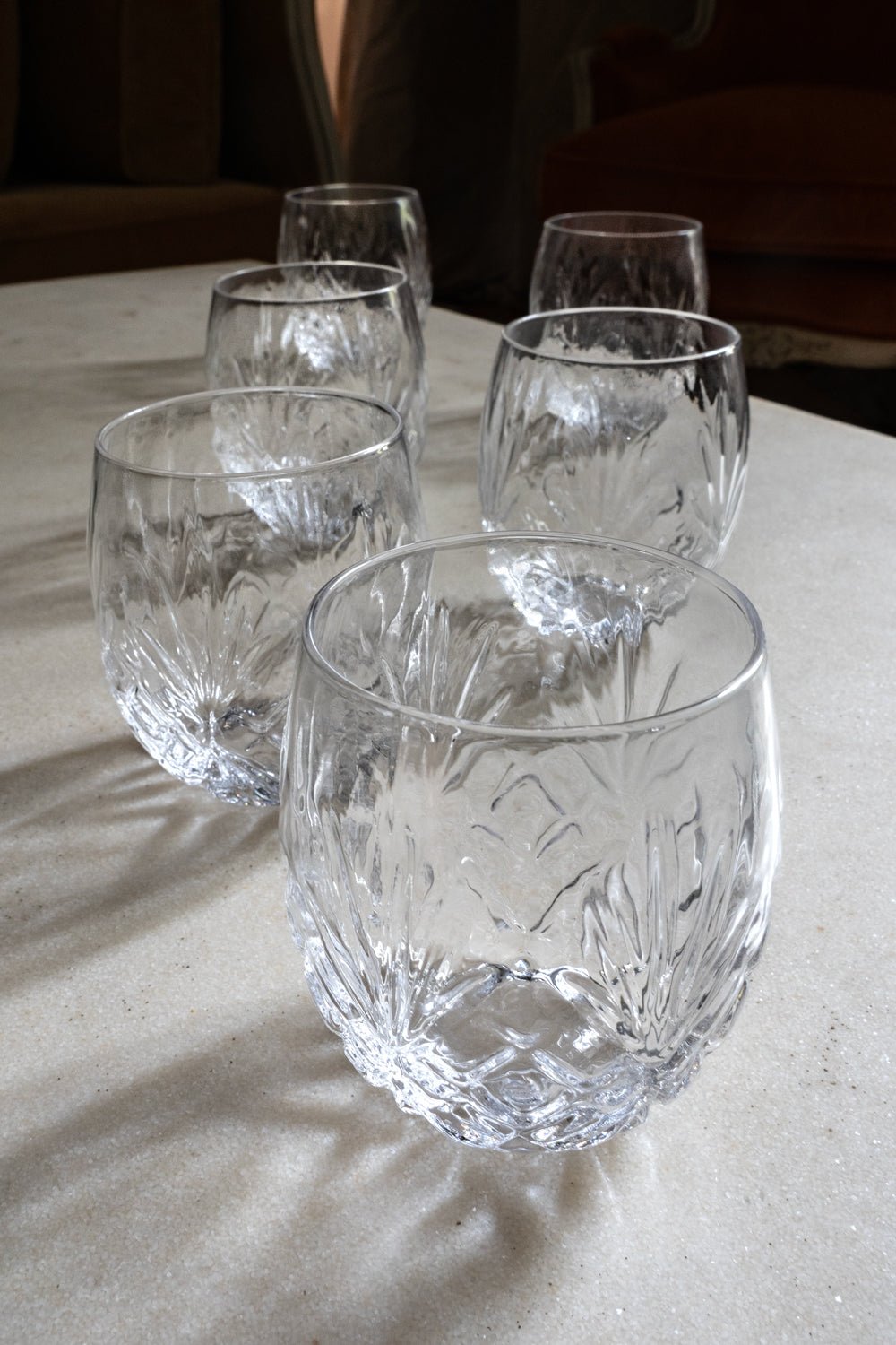 Set mit 18 Teilen unserer geschnitzten Glaswaren mit einem Cluster-Spitzen-Design, hergestellt aus sehr widerstandsfähigem Kalknatronglas.