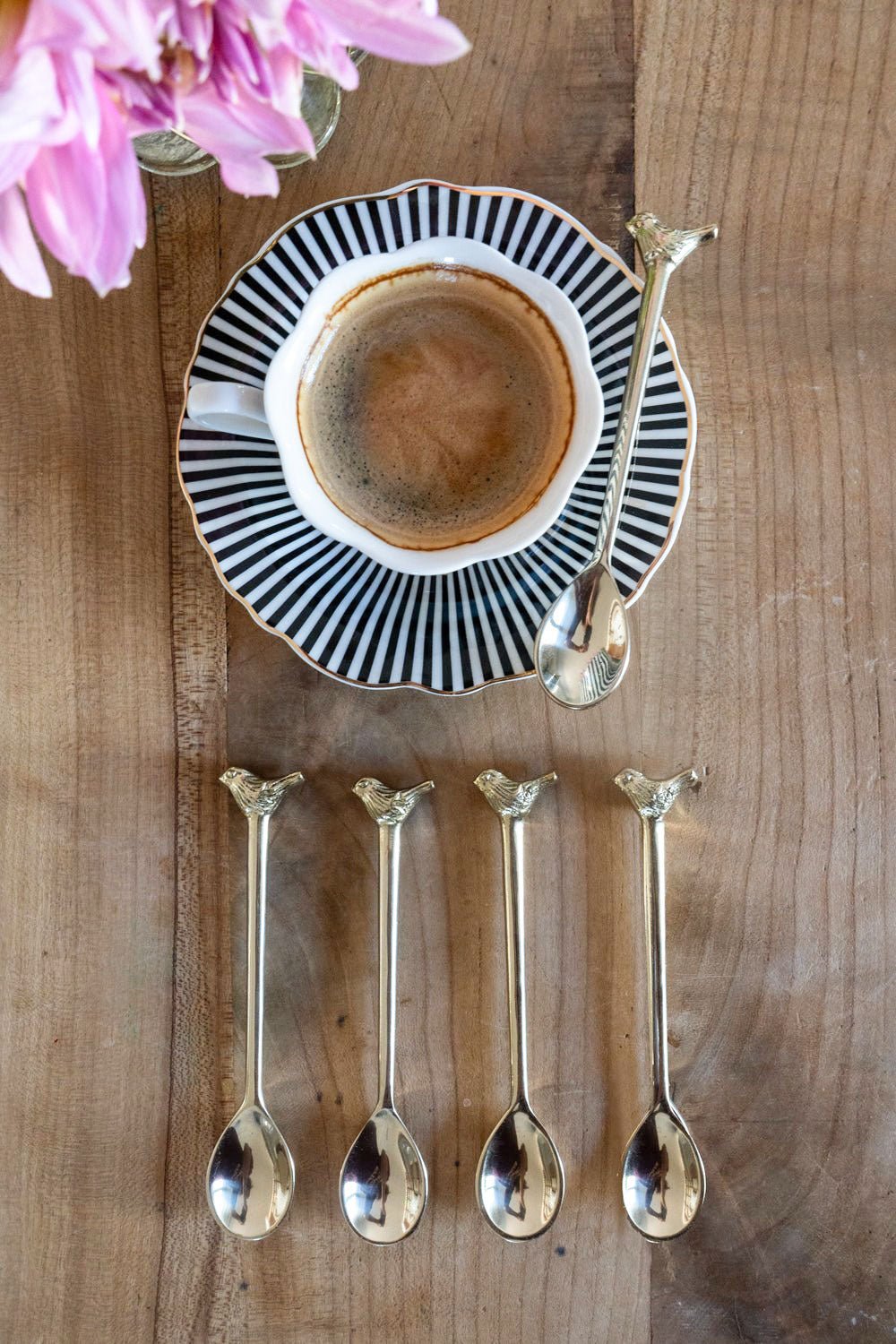 Dieses elegante Set aus vier Bronzelöffeln ist die perfekte Ergänzung für jeden Tisch. Am Ende haben sie die Figur eines zarten Vogels, was sie zu einem einzigartigen Geschenk macht.
