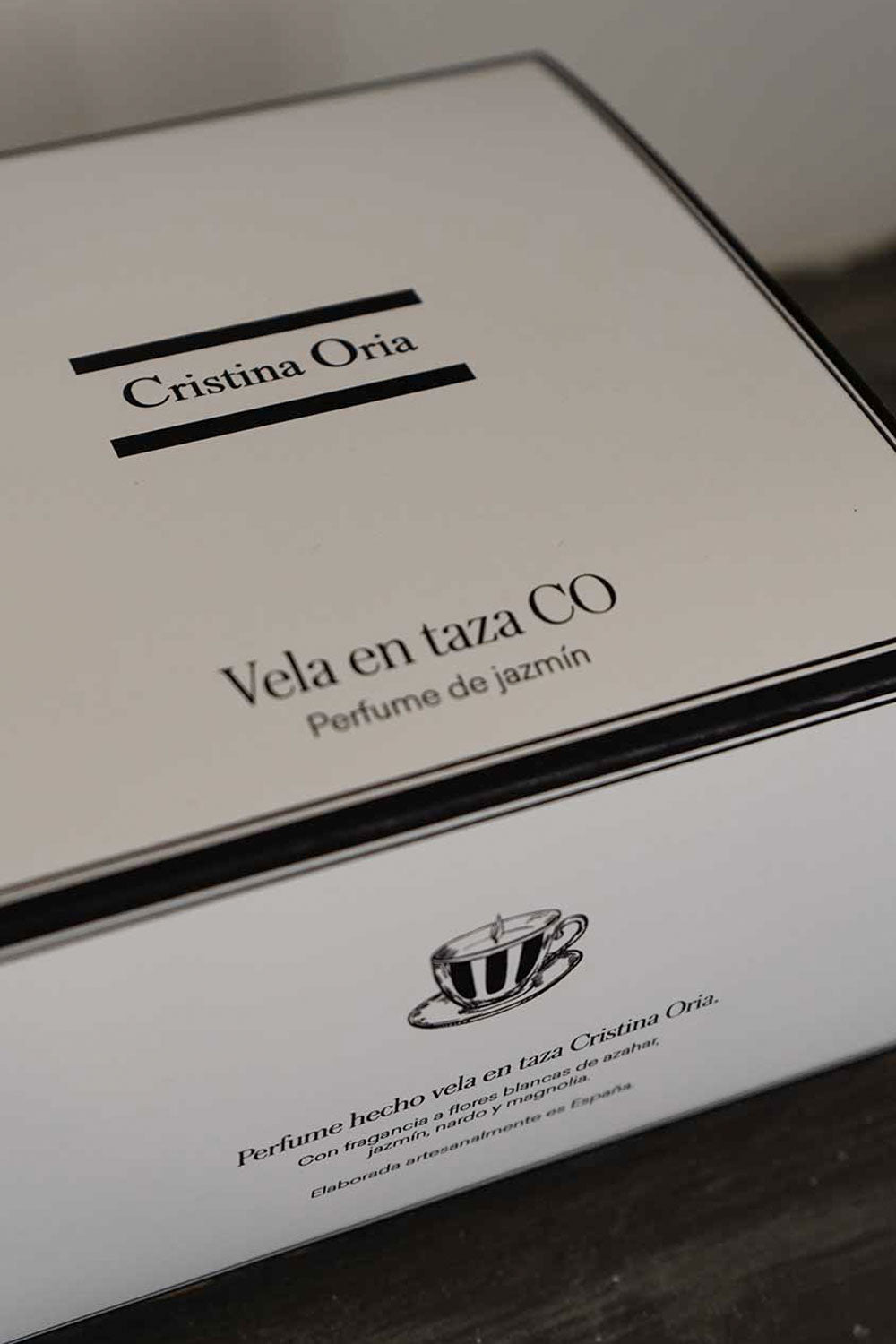 Bougie parfumée dans une tasse Cristina Oria avec sa sous-tasse. Parfums de fleurs blanches d’oranger, de jasmin, de tubéreuse et de magnolia. Développée en collaboration avec les principales parfumeries françaises.