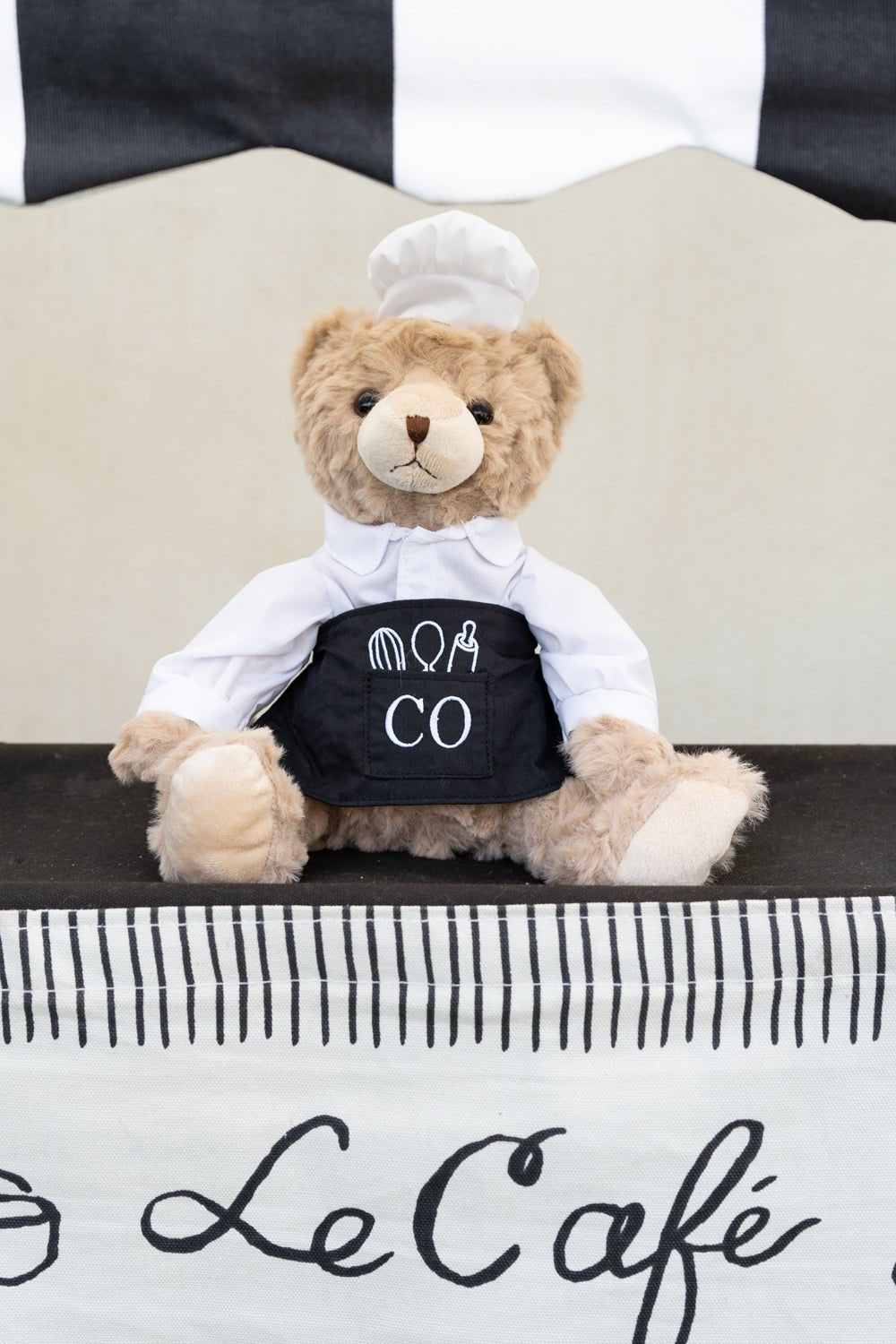 - Ours en peluche chef CO : Depuis la naissance de « Minichef », qui a maintenant neuf ans, nous avons toujours voulu avoir un ours en peluche chef CO. Depuis, nous avons travaillé sur son design et nous avons voulu penser aux moindres détails, pour finalement aboutir à cette peluche idéale