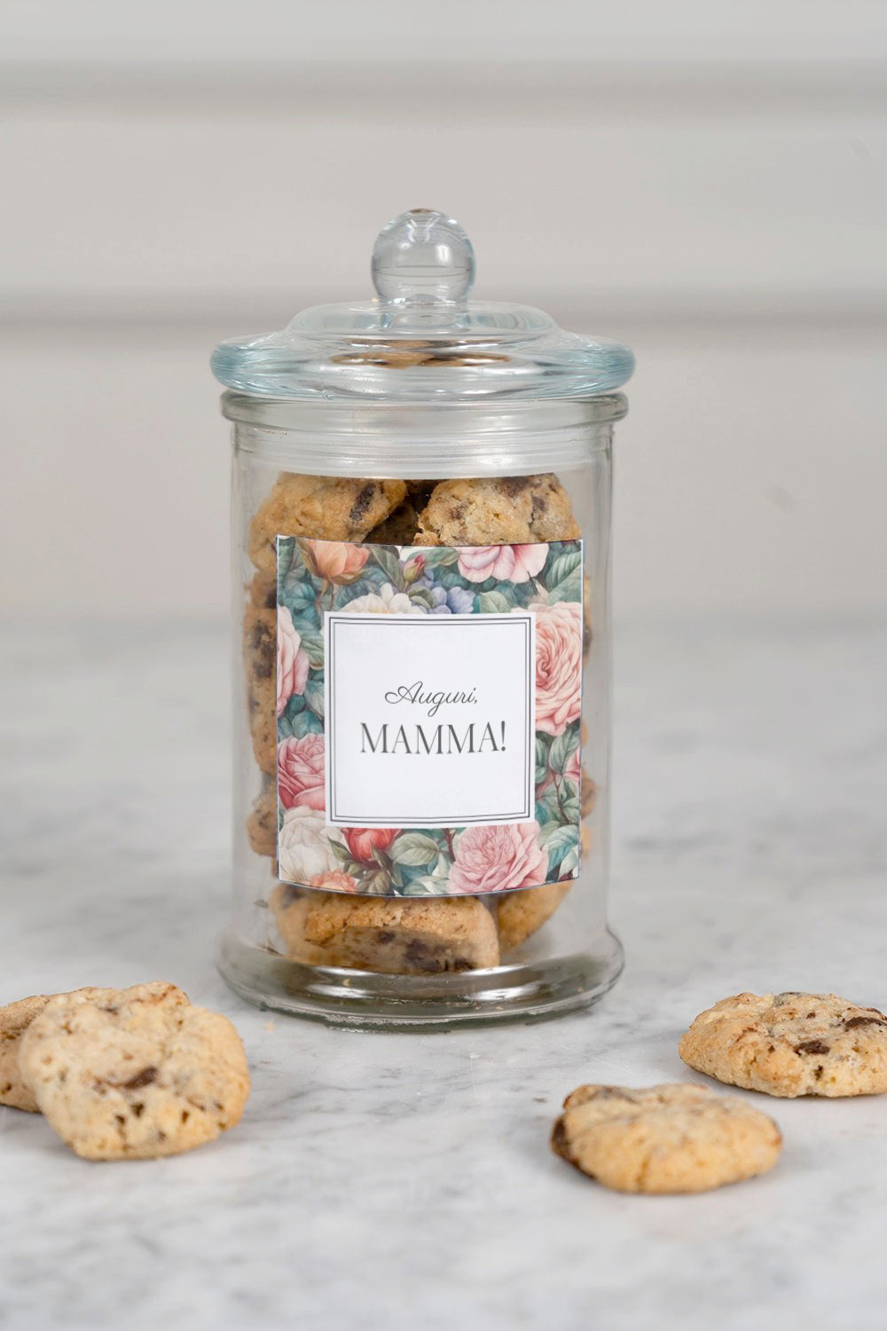 - Biscotti in barattolo di vetro da 110 g e adesivo con messaggio speciale "Congratulazioni mamma"