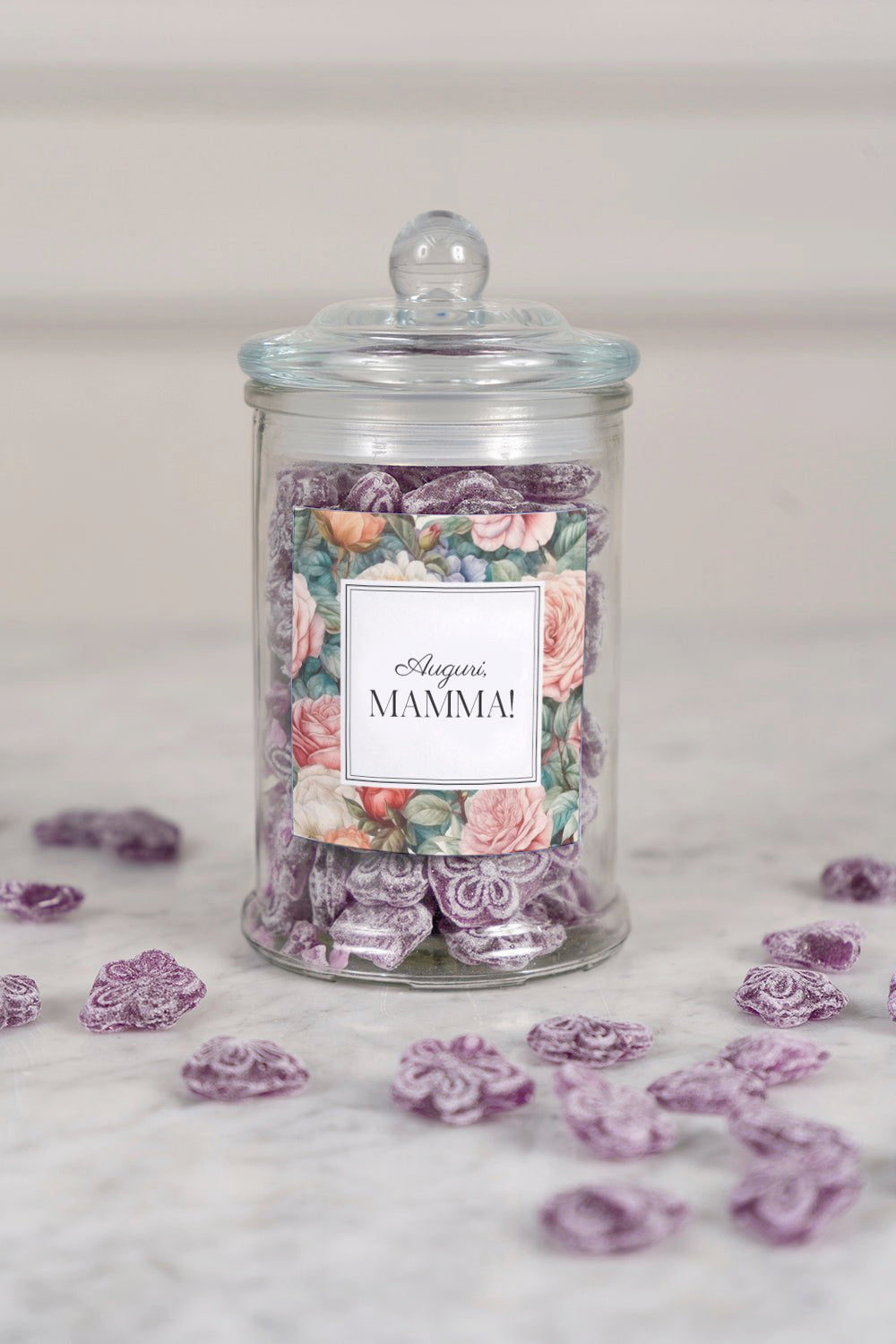 - Deliziose violette senza glutine presentate in un barattolo di vetro con dedica "Congratulazioni mamma"