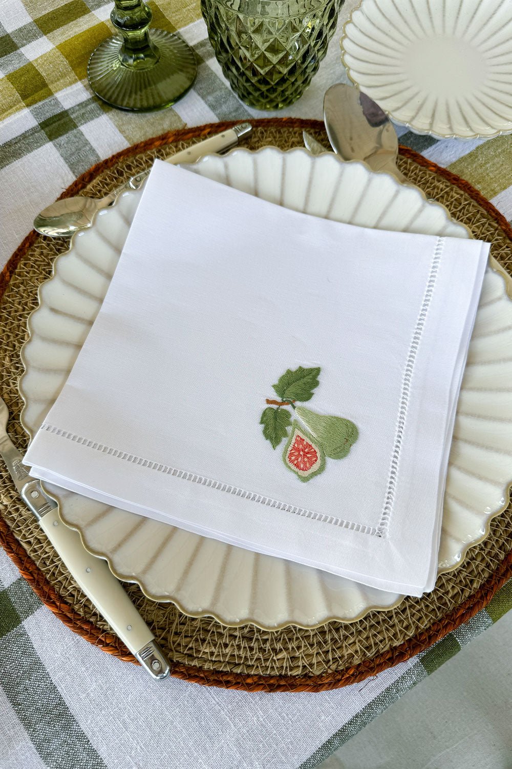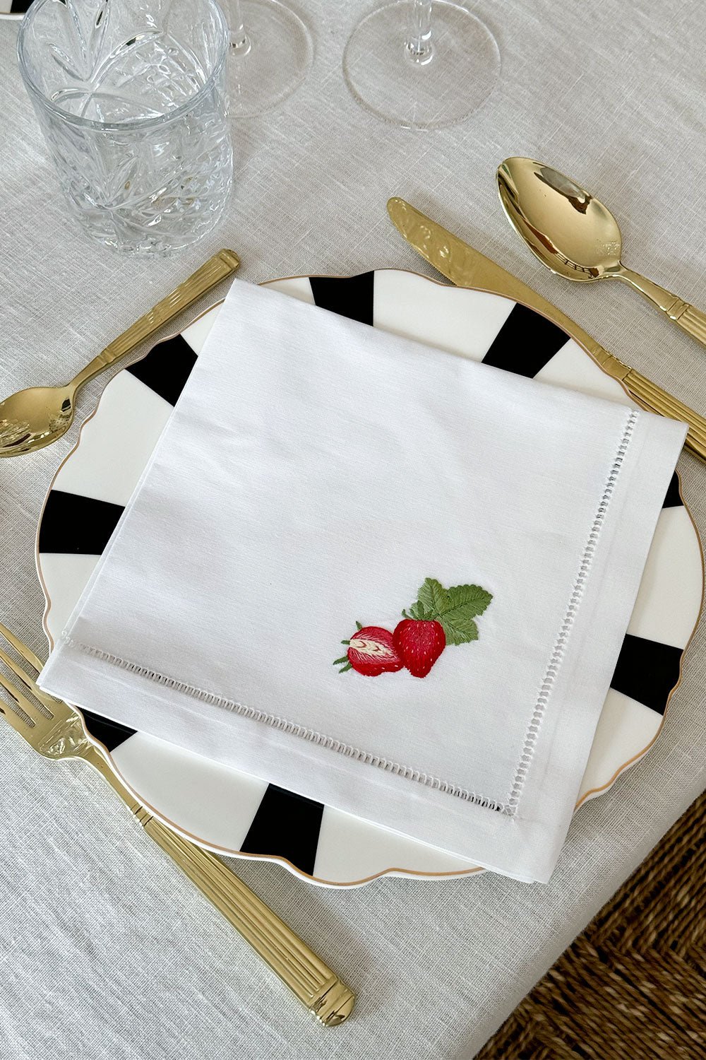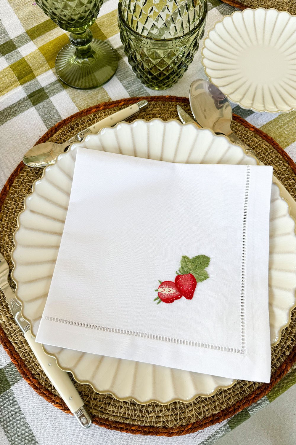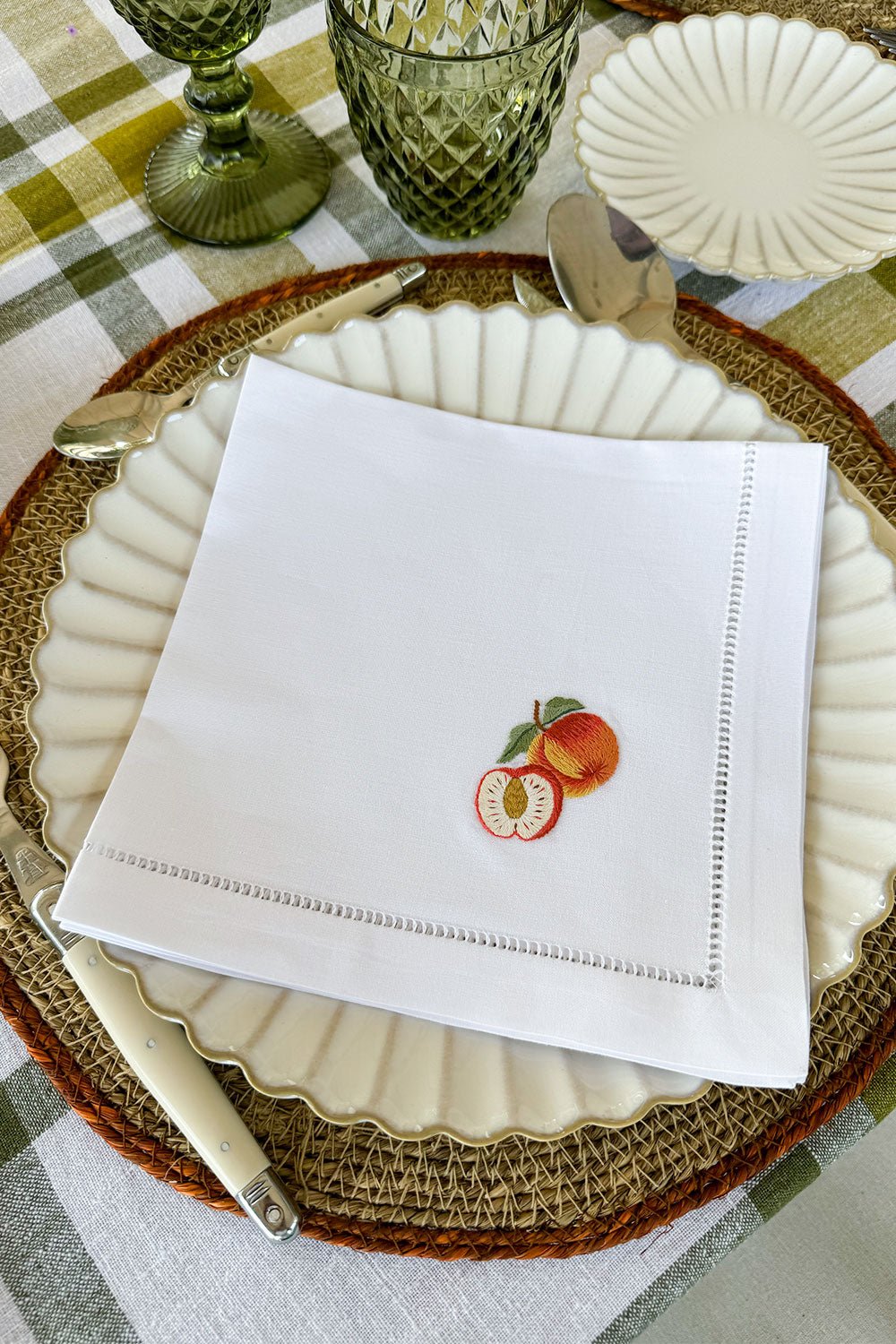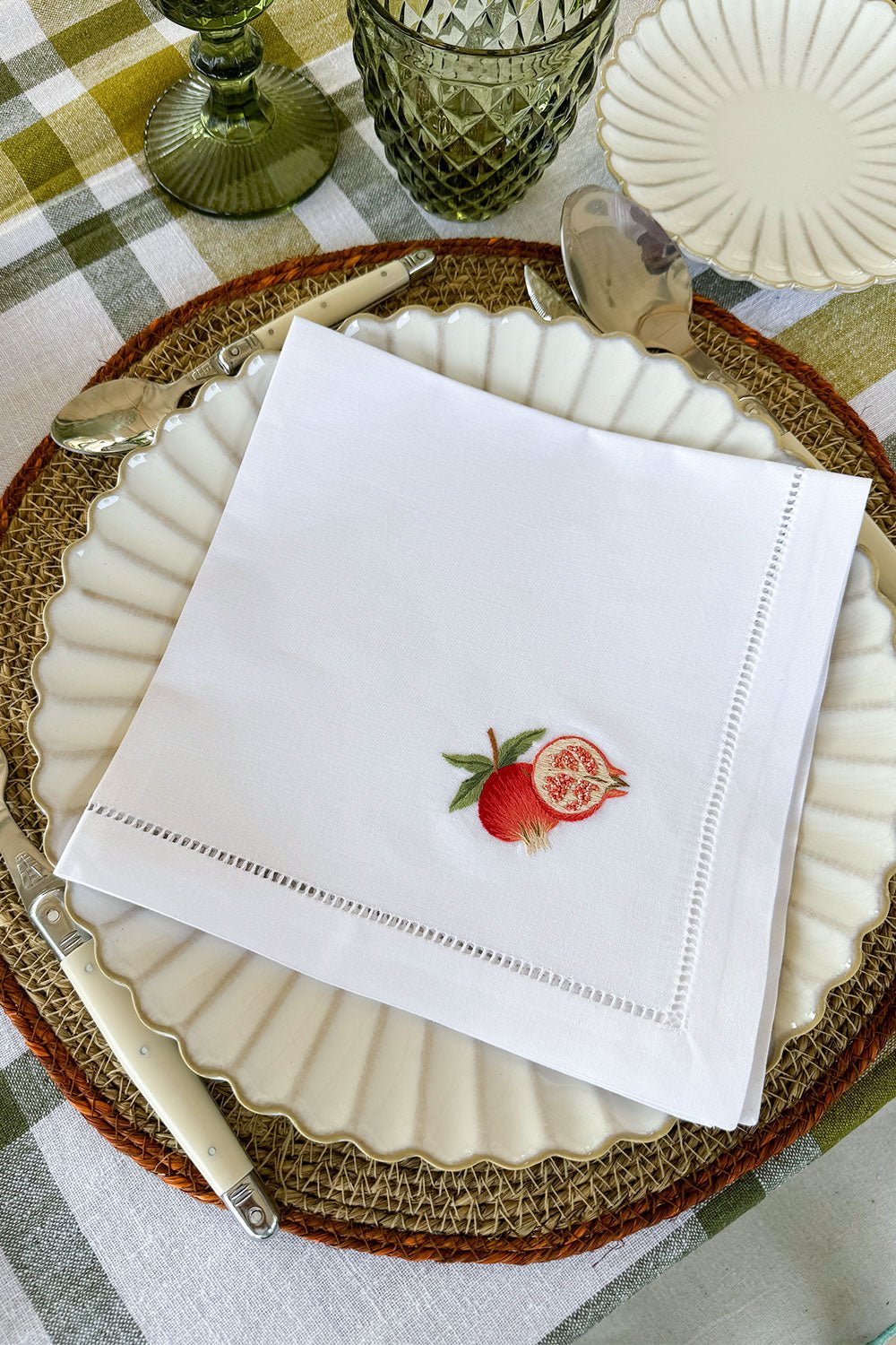 Questo set di sei tovaglioli in cotone 100% ricamati a mano è perfetto per aggiungere un tocco di naturale eleganza alla tua tavola. Ogni tovagliolo presenta una delicata illustrazione di un frutto diverso, accuratamente ricamato a mano con fili di colore diverso.