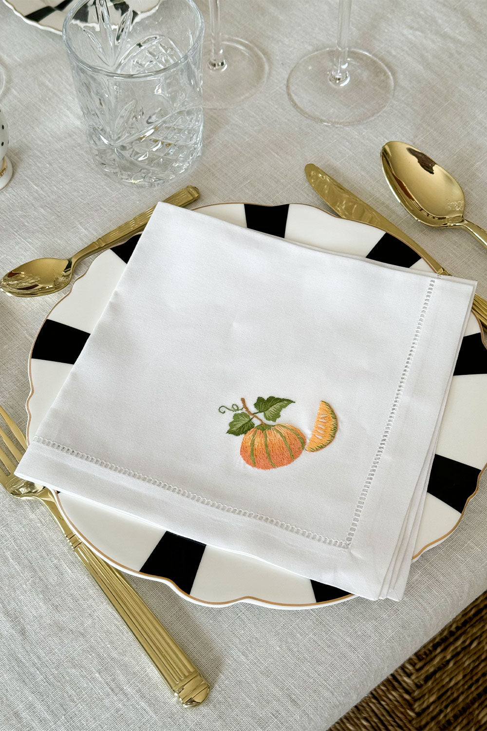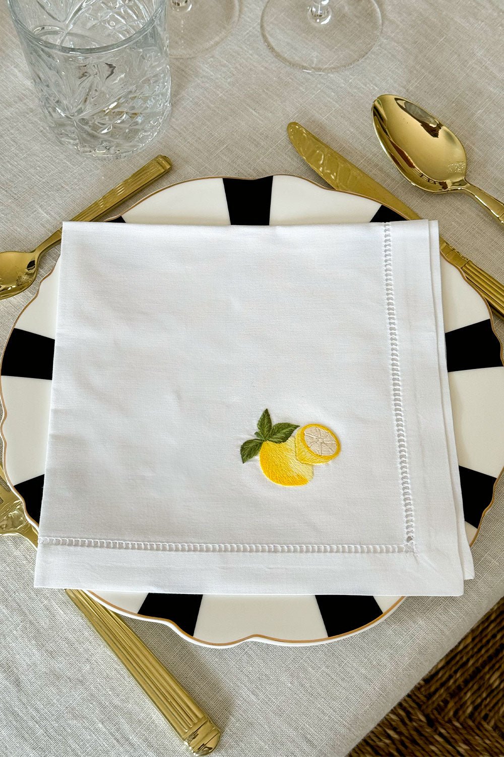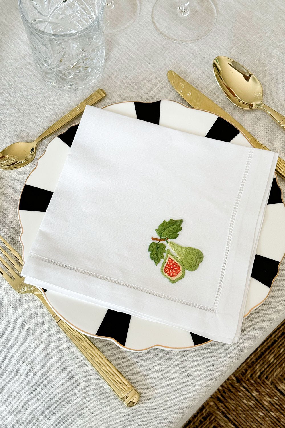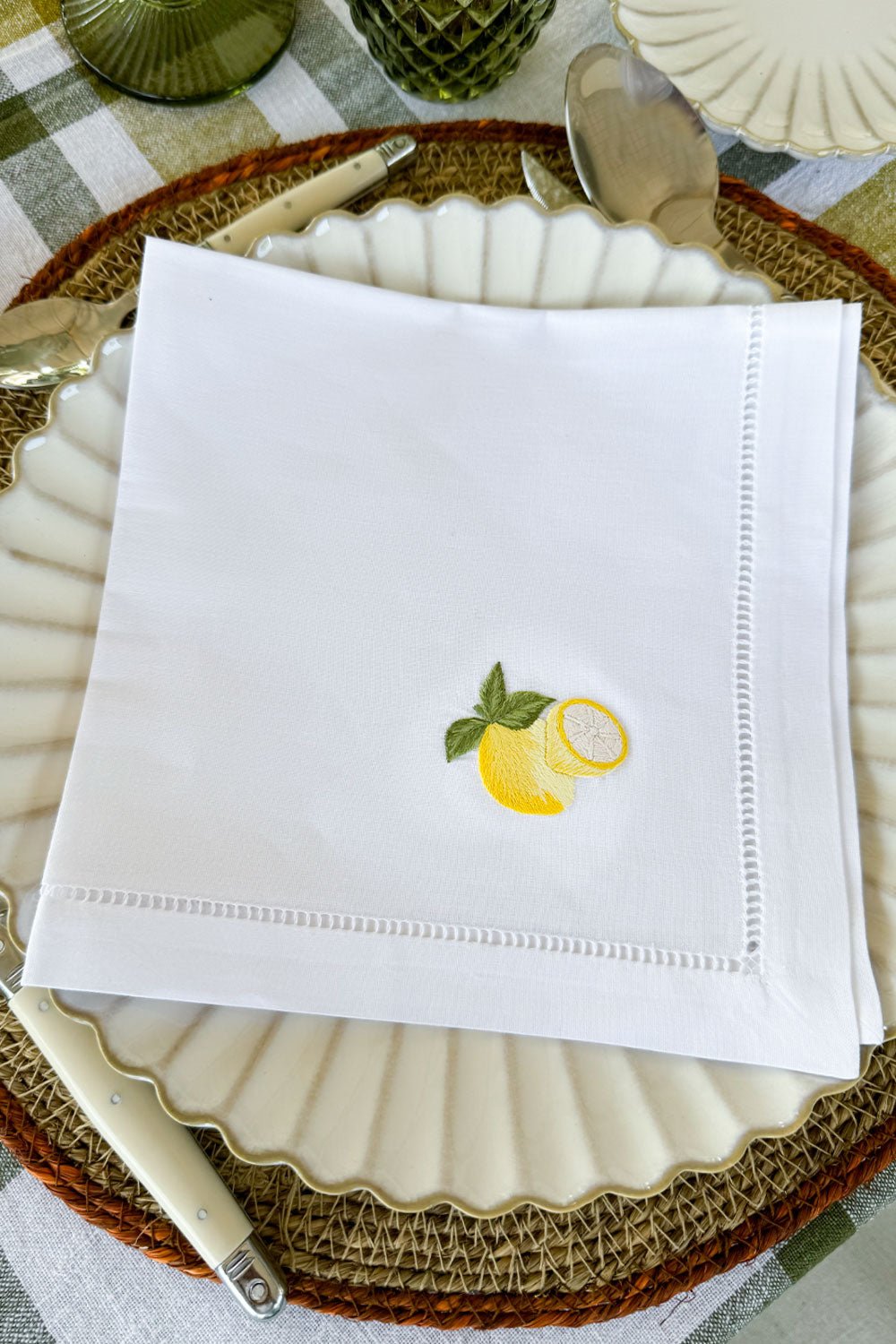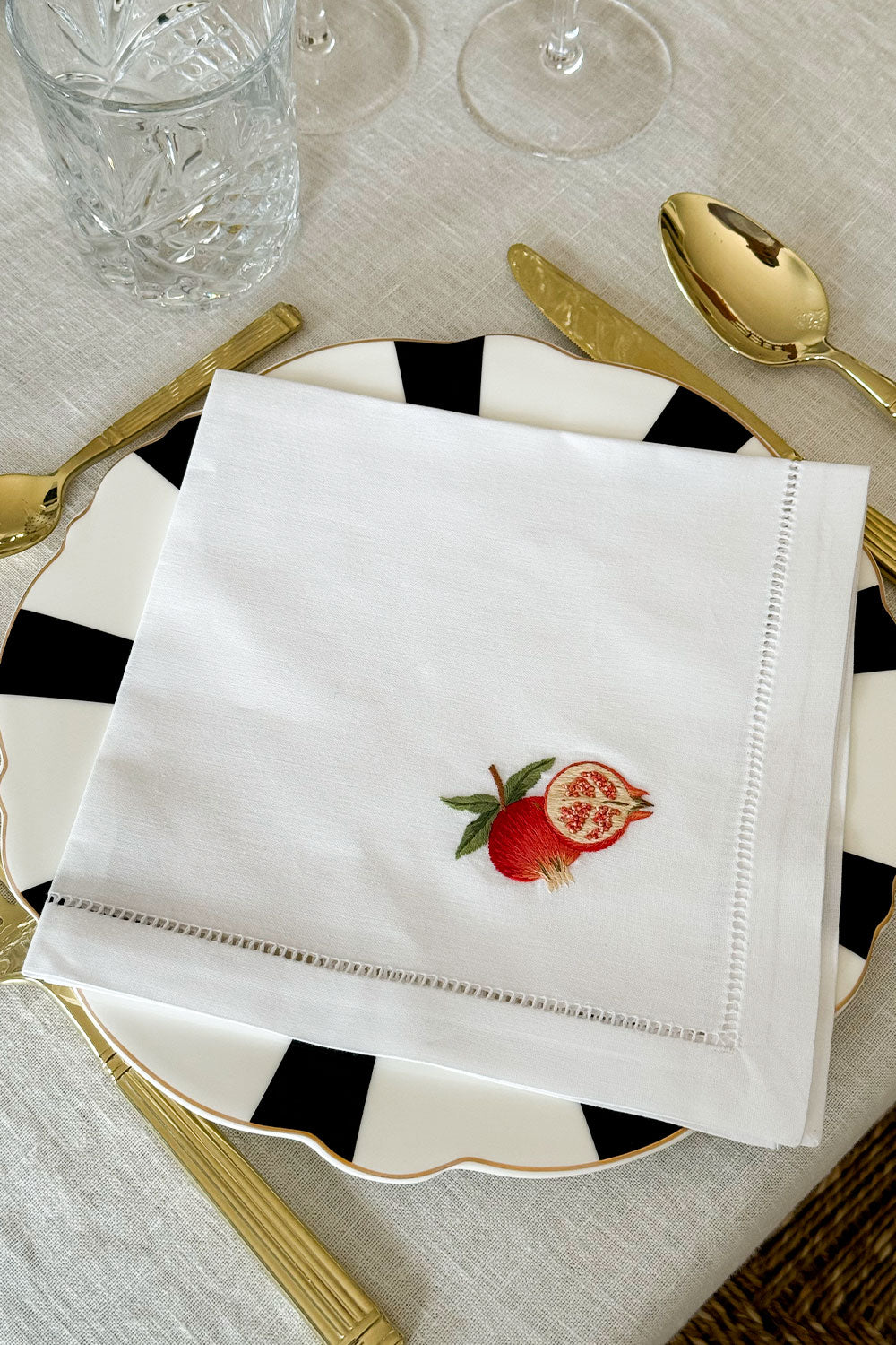 Questo set di sei tovaglioli in cotone 100% ricamati a mano è perfetto per aggiungere un tocco di naturale eleganza alla tua tavola. Ogni tovagliolo presenta una delicata illustrazione di un frutto diverso, accuratamente ricamato a mano con fili di colore diverso.