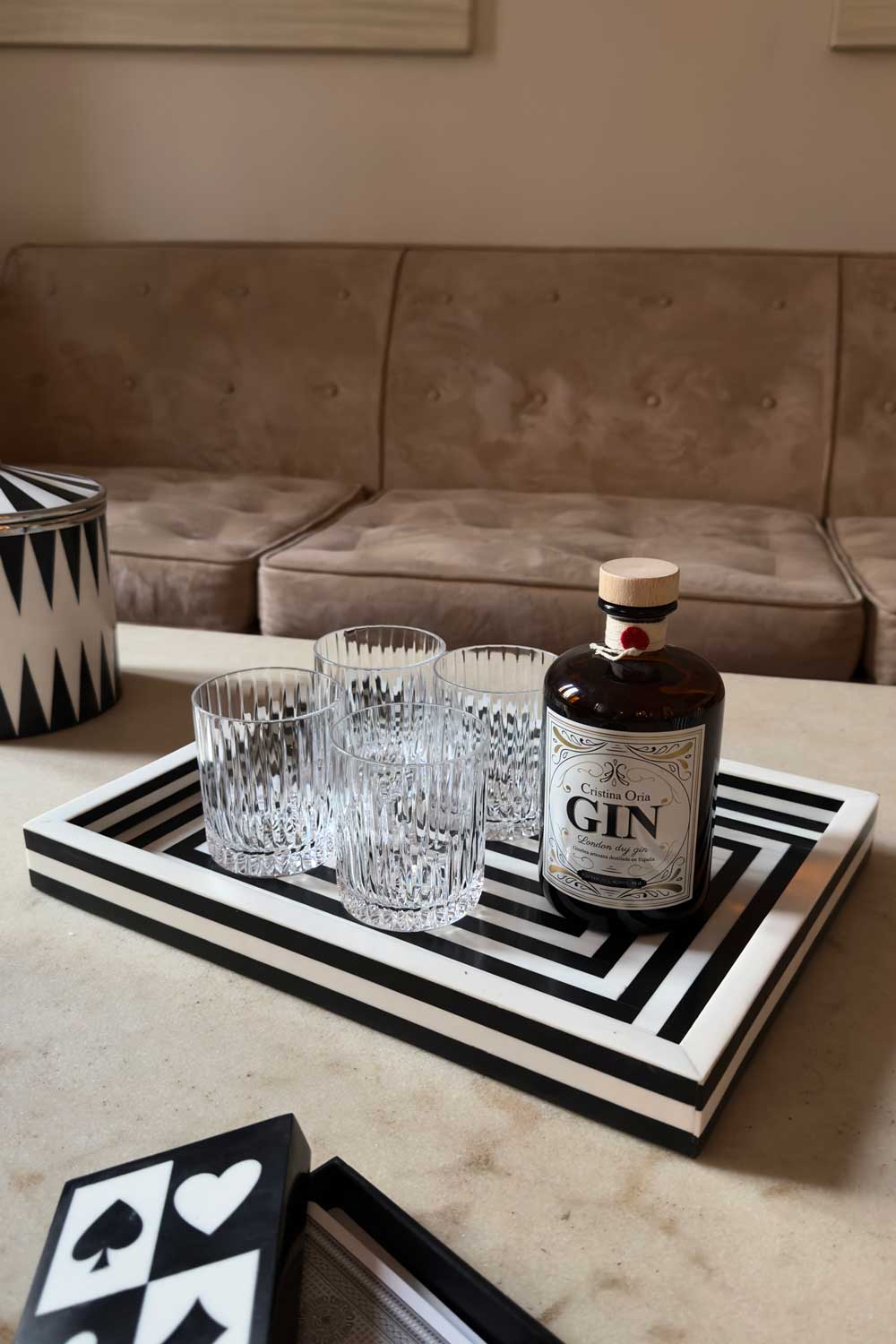 Bandeja rectangular elaborada en resina, con un elegante diseño de rayas blancas y negras que aporta un estilo moderno y sofisticado. Elaborada con patrones únicos y fabricada de manera artesanal.