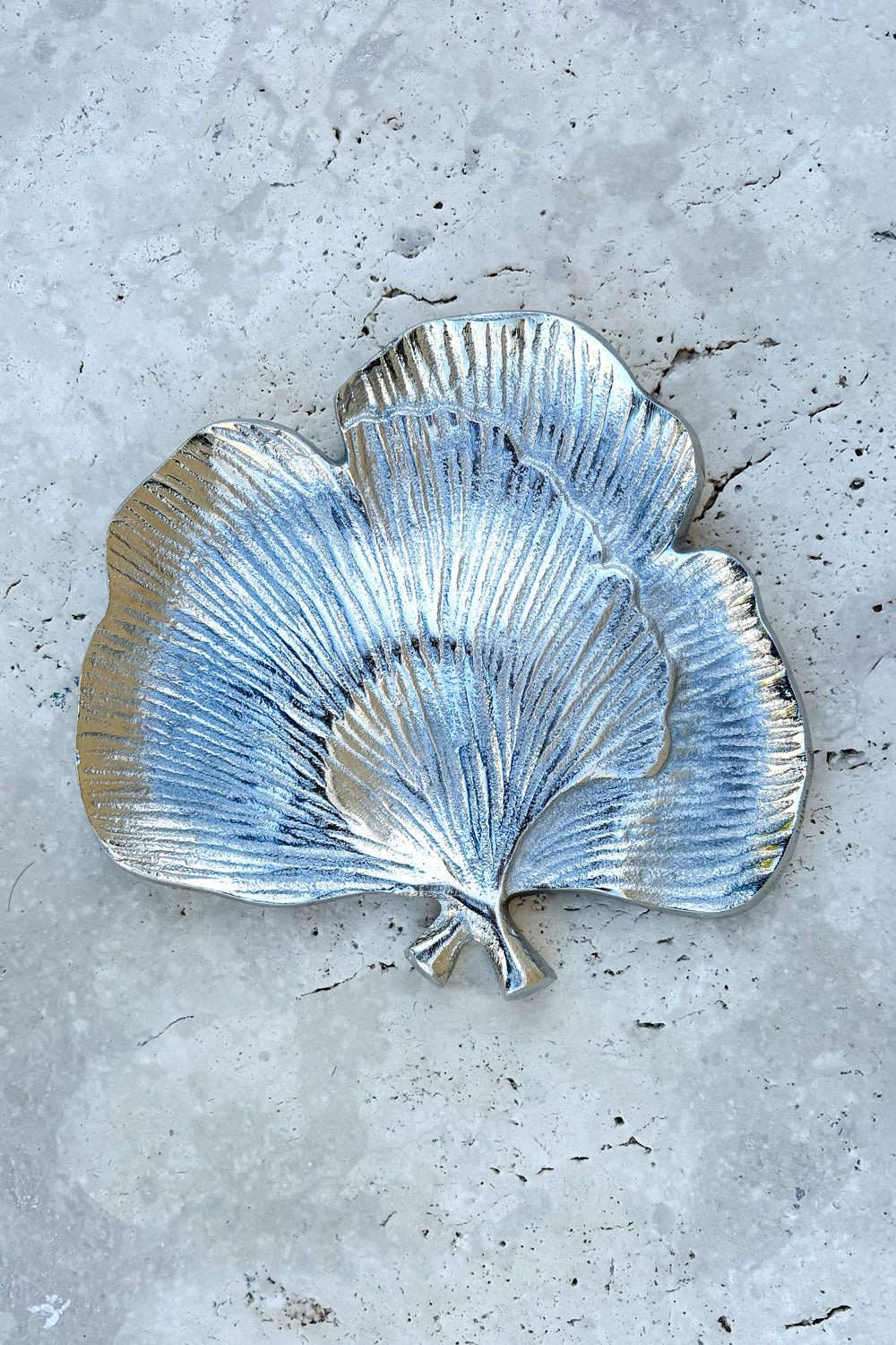 Bandeja pequeña de aluminio con original diseño de hoja de ginkgo. Su acabado brillante y detallado realza la belleza de cualquier superficie, convirtiéndola en una pieza ideal para servir delicados aperitivos o como objeto decorativo.