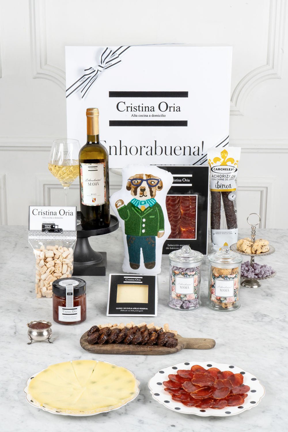 Esta caja para regalar a las recién mamás incluye además de varios productos gourmet para ellas, un cojín ideal bordado para decorar la habitación del recién nacido.