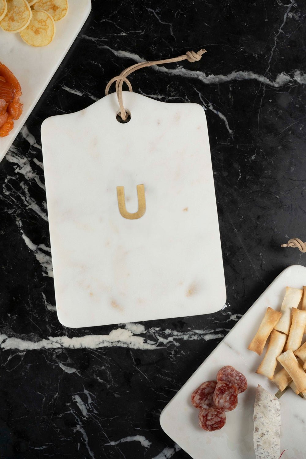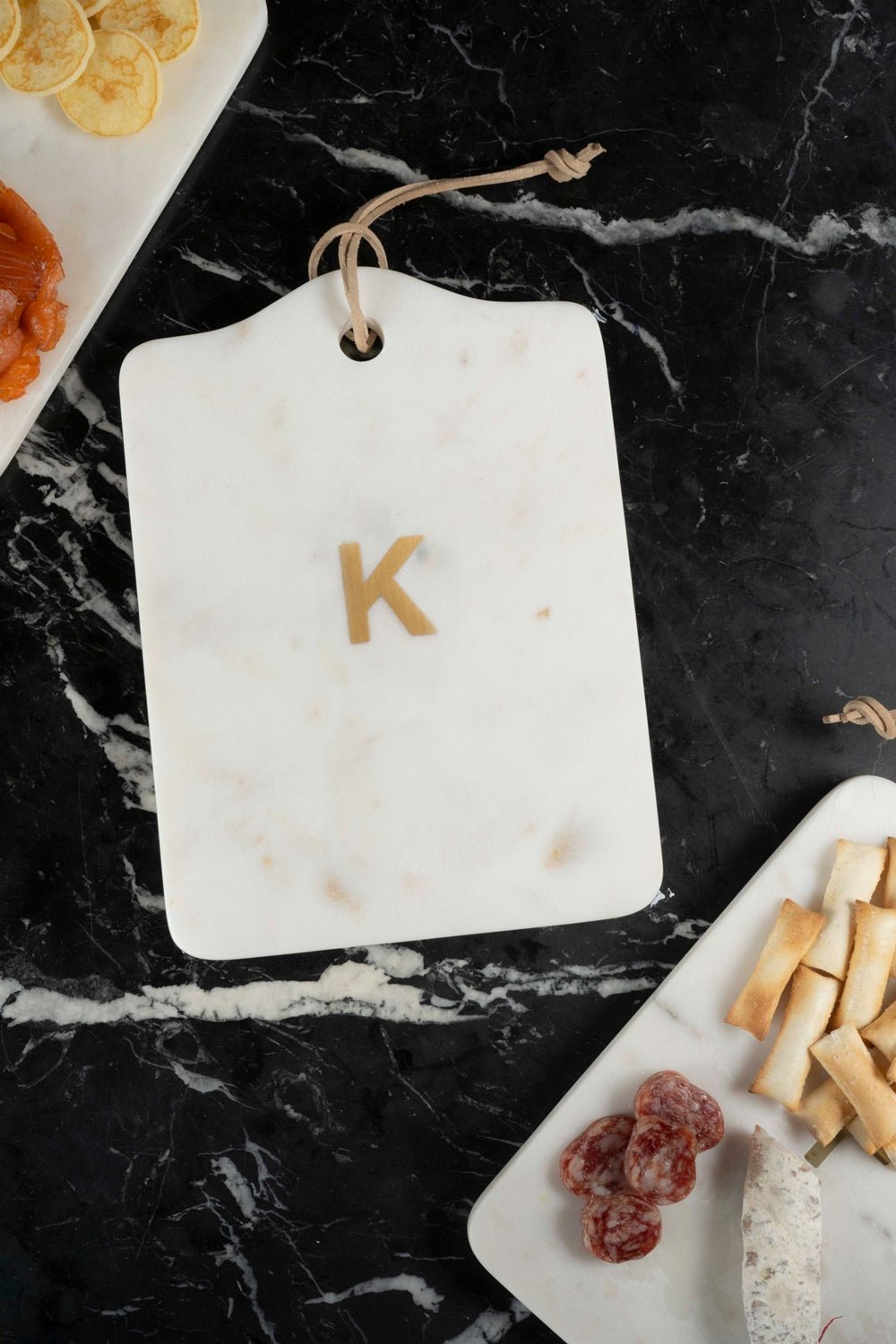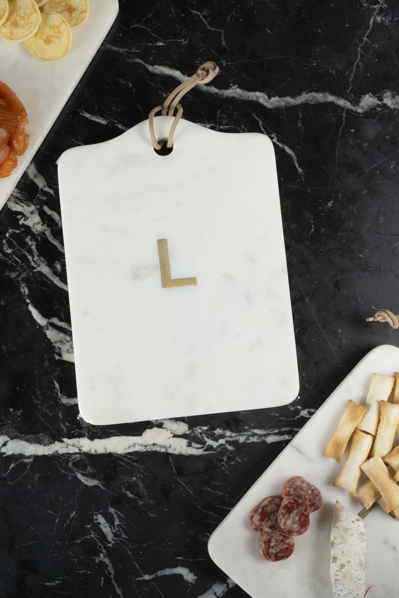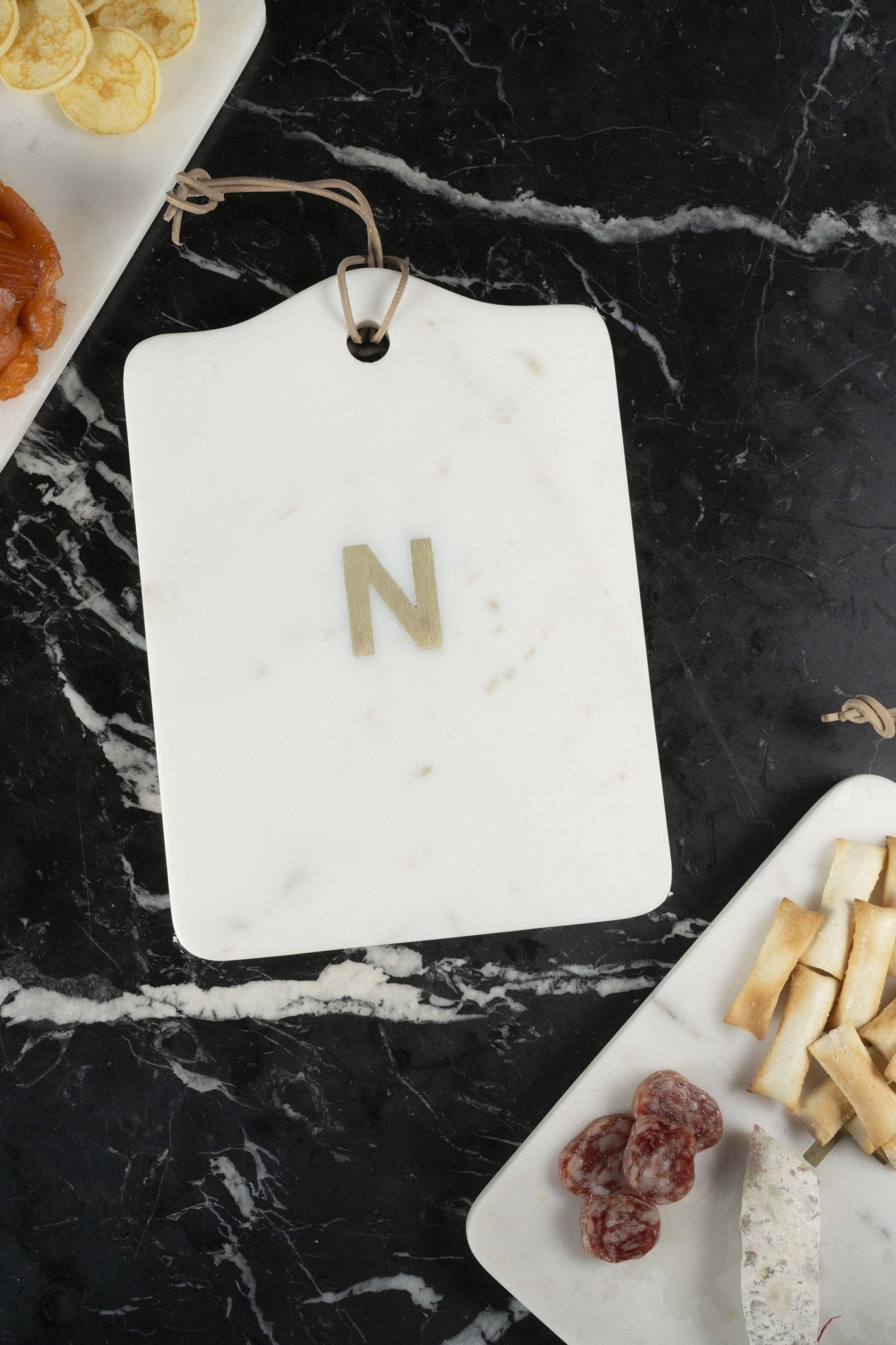 - Tabla rectangular de mármol con inicial (a escoger) en latón dorado