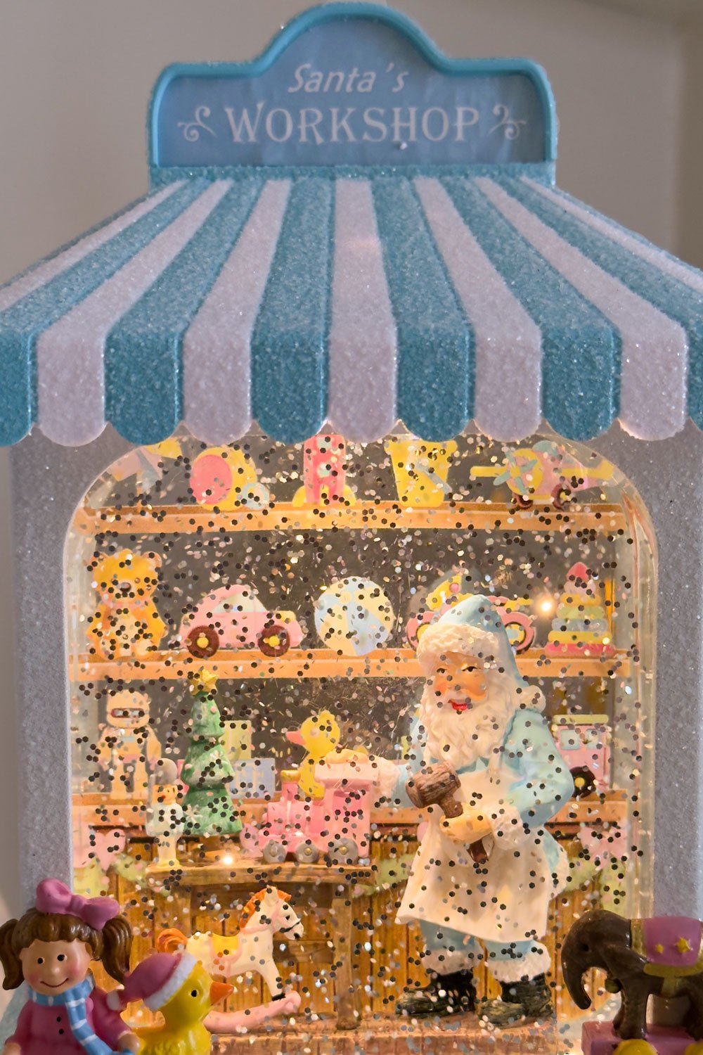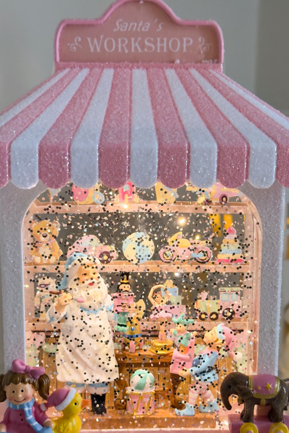 Pieza decorativa con un alegre diseño de carrito inspirado en el taller de Papá Noel, llena de encanto y espíritu navideño. Su acabado con purpurina aporta un brillo mágico, mientras que las pequeñas luces LED integradas iluminan la escena y crean un ambiente cálido y festivo. Disponible en dos combinaciones de color (rayas azules y blancas, o rosas y blancas) para que puedas escoger la que mejor se adapte a tu decoración.