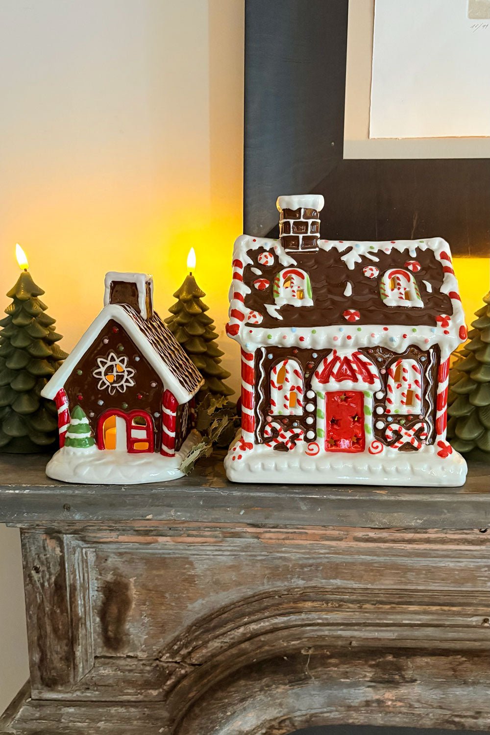 Casa de jengibre de cerámica, elaborada con gran detalle y diseñada para permitir colocar una vela en su interior, creando un brillo cálido y acogedor. Una pieza decorativa perfecta para aportar sofisticación y espíritu navideño a cualquier ambiente.