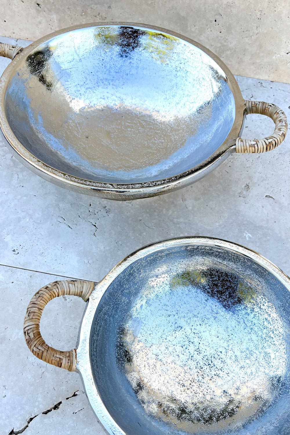 Centro de mesa mediano de aluminio con asas recubiertas de mimbre, ideal para complementar tus mesas, para usar como centro de mesa o frutero, e incluso para decorar cualquier rincón de tu casa. Su acabado brillante aporta un toque de lujo, mientras que las asas de ratán añaden un detalle rústico.