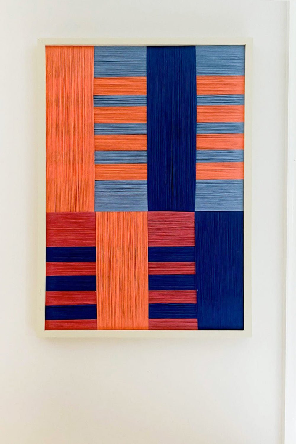 Este cuadro de diseño trenzado con cuerdas de fibras en una gama de tonalidades azules, ofrece un diseño abstracto exclusivo que eleva el ambiente de cualquier espacio.