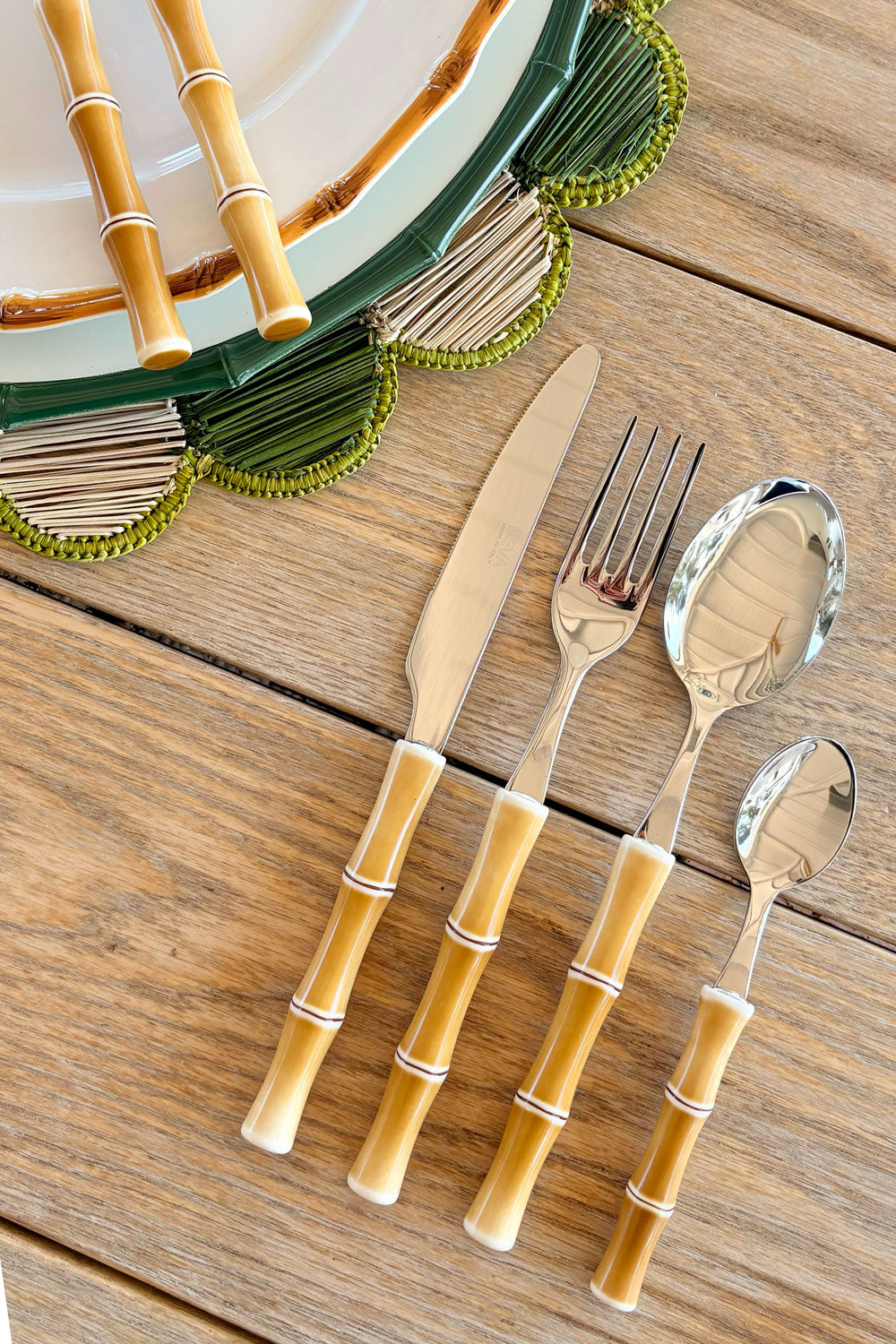 Cubiertos con un delicado diseño inspirado en el bambú que aportan frescura y carácter a la mesa. Sus mangos evocan la estética natural de este material, creando una pieza elegante y atemporal que combina fácilmente con diferentes estilos de vajilla y decoración.