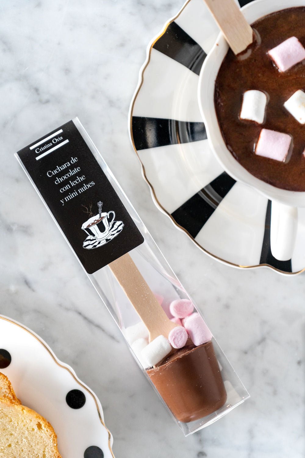 Esta cuchara de chocolate con mini nubes es un dulce y divertido detalle para estas fiestas. Hecha con chocolate de alta calidad, está adornada con pequeñas nubes que, al sumergirla en un vaso de leche caliente o en el café, se derriten y se fusionan con el chocolate, creando una bebida suave y cremosa con un toque esponjoso.