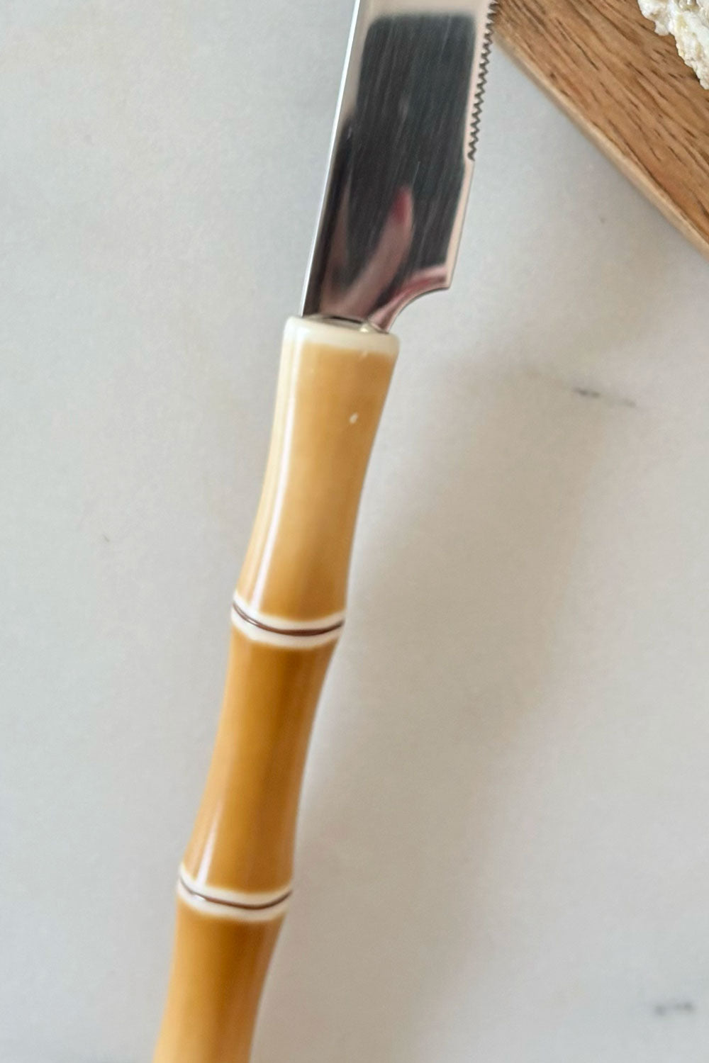 Cuchillo especial para cortar quesos de nuestra cubertería con delicado diseño inspirado en el bambú, que aporta frescura y carácter a la mesa. Su mango evoca la estética natural de este material, creando una pieza elegante y atemporal que combina fácilmente con diferentes estilos de vajilla y decoración.