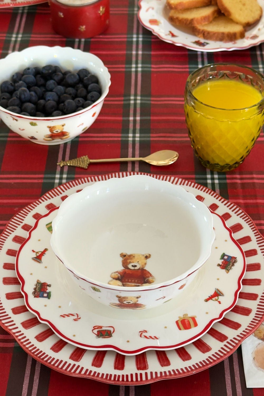 Esta vajilla de cerámica navideña para niños está decorada con un osito vestido con su jersey de Navidad, acompañado de pequeños dibujos de regalos, caramelos y trenecitos alrededor del borde. Sus colores alegres y su diseño tierno hacen que cada comida se convierta en un momento mágico y festivo. Perfecta para que los más pequeños disfruten de la Navidad en la mesa.