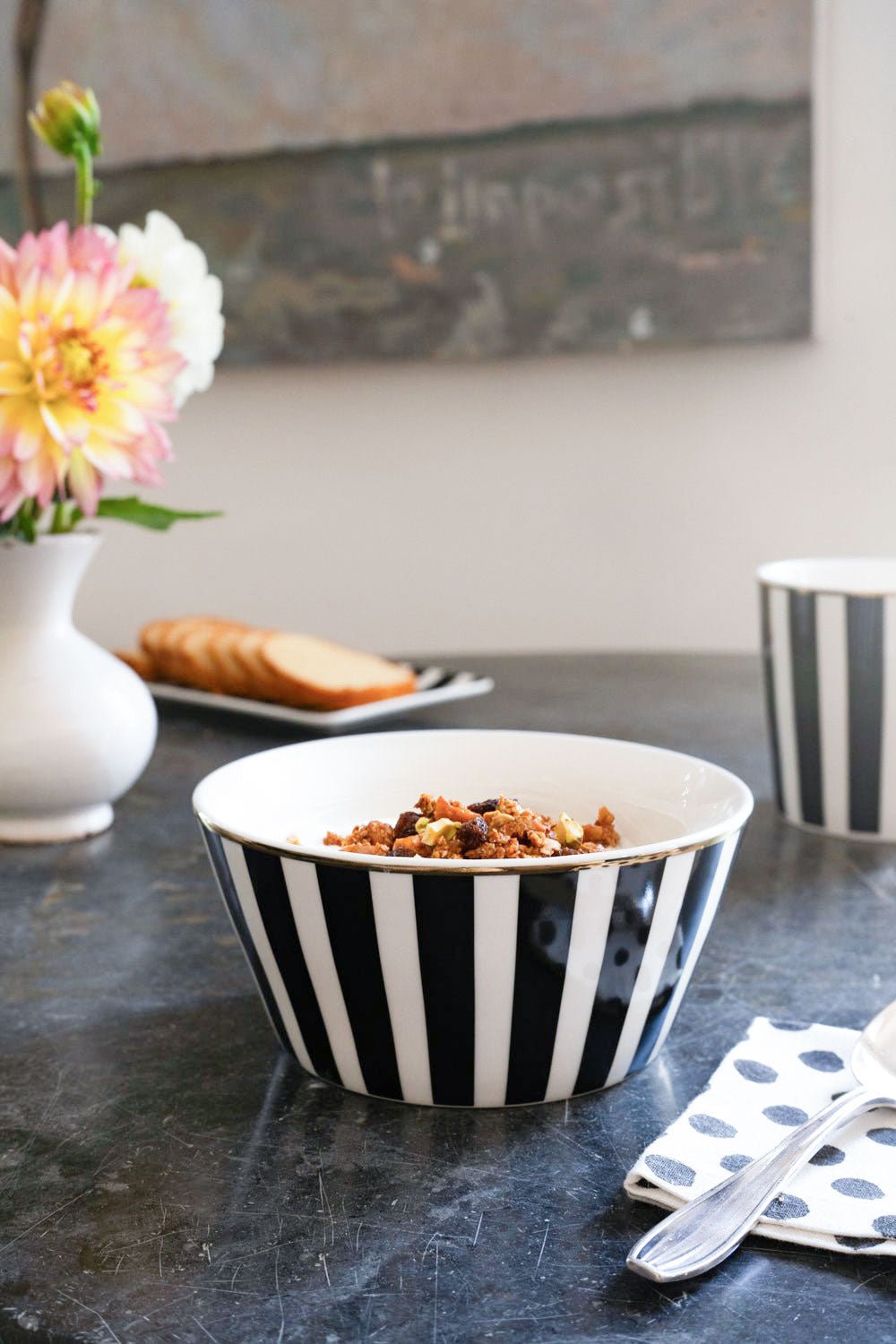 Cuenco negro y blanco con diseño de rayas y delicado filo dorado decorando, perfecto tanto para su uso diario como para ocasiones especiales, añadiendo un toque de elegancia a cualquier momento del día.