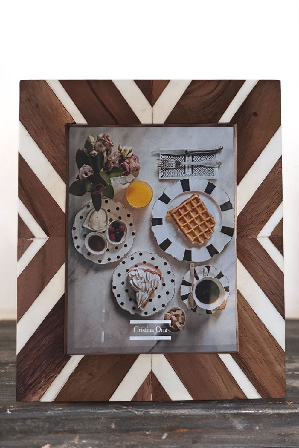 Marco de fotos de madera con diseño de rayas en colores blancas y marrones, ideal para decorar cualquier rincón de tu casa durante cualquier época del año.