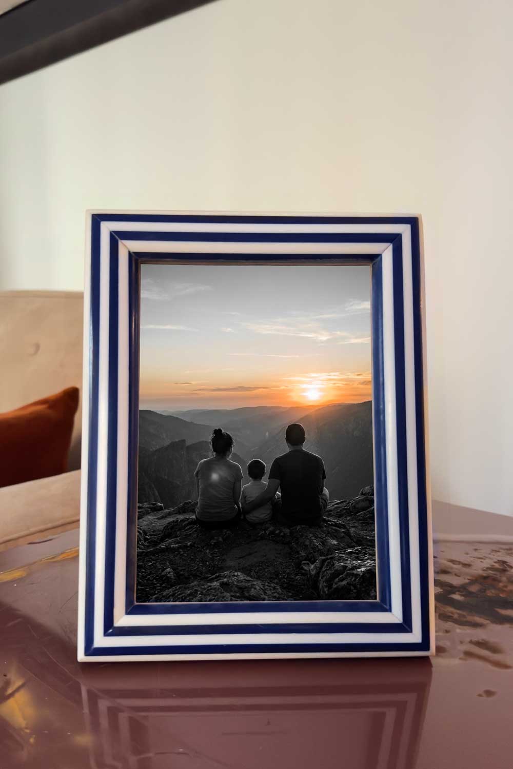 Marco de fotos elaborado en resina, con un elegante diseño de rayas blancas y azules que aporta frescura y un estilo clásico y contemporáneo a la vez. Fabricado de manera artesanal, cada pieza presenta patrones únicos e irrepetibles.