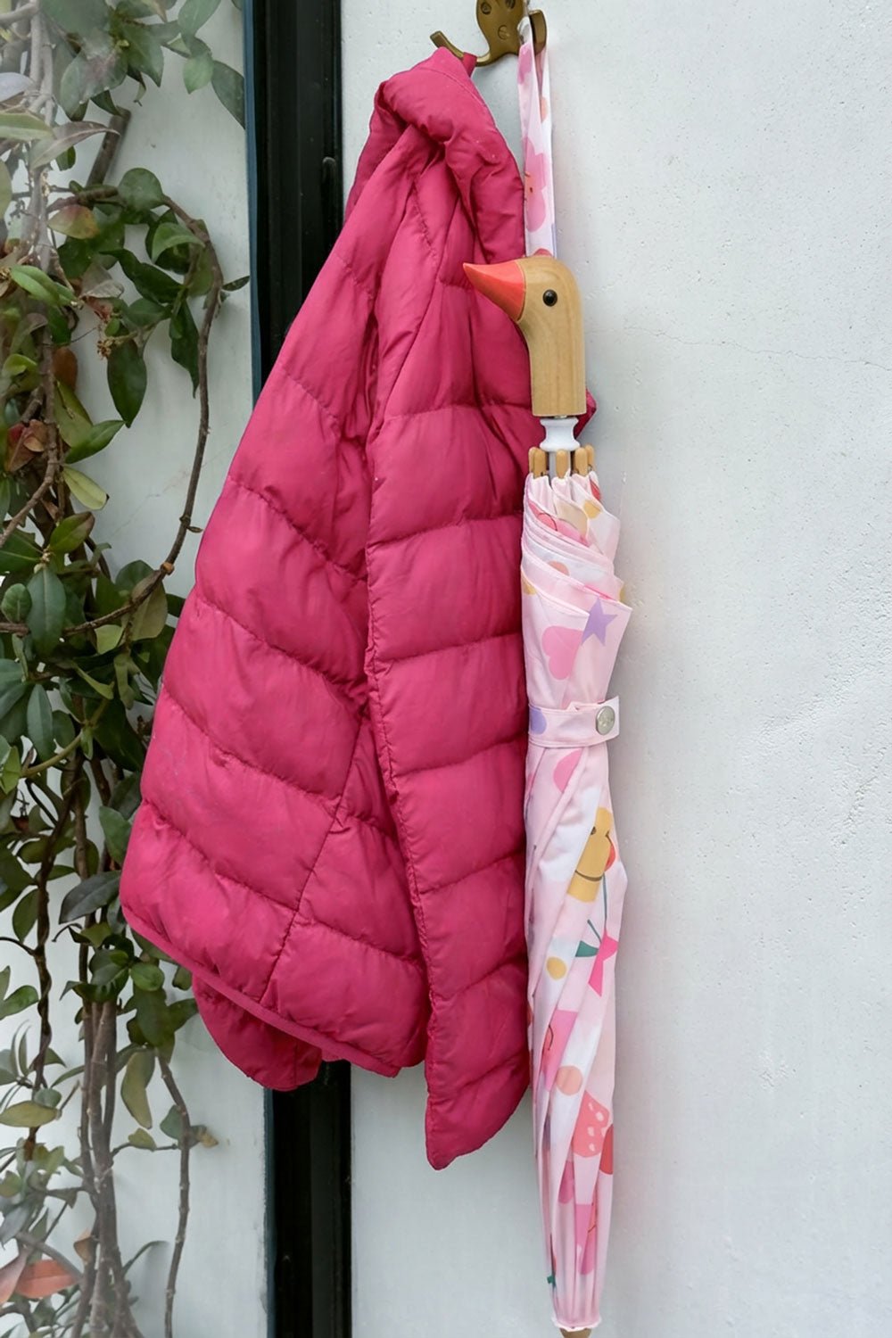 Este paraguas infantil con diseño de distintas figuras alegres y coloridas está hecho a mano a partir de nueve botellas de plástico, con tela 100% reciclada y un mango de madera de origen sostenible.