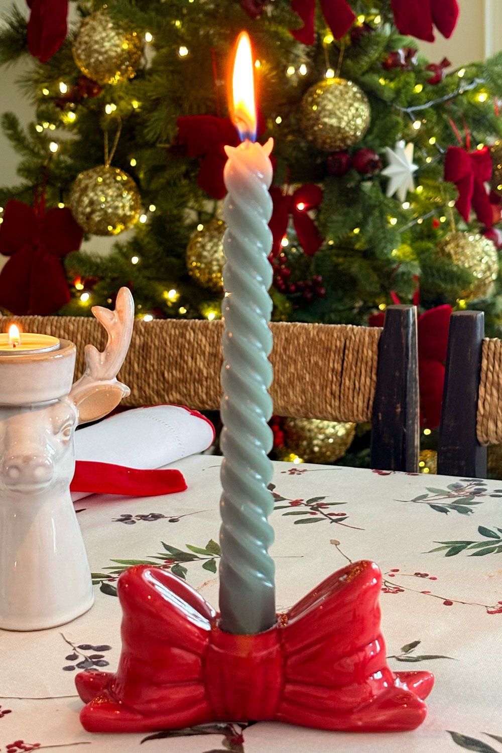 Este portavelas de porcelana con diseño de lazo rojo y acabado brillante, es ideal para complementar la decoración de tus mesas, estanterías o centros de mesa combinándolo con coronas y guirnaldas durante la temporada navideña.