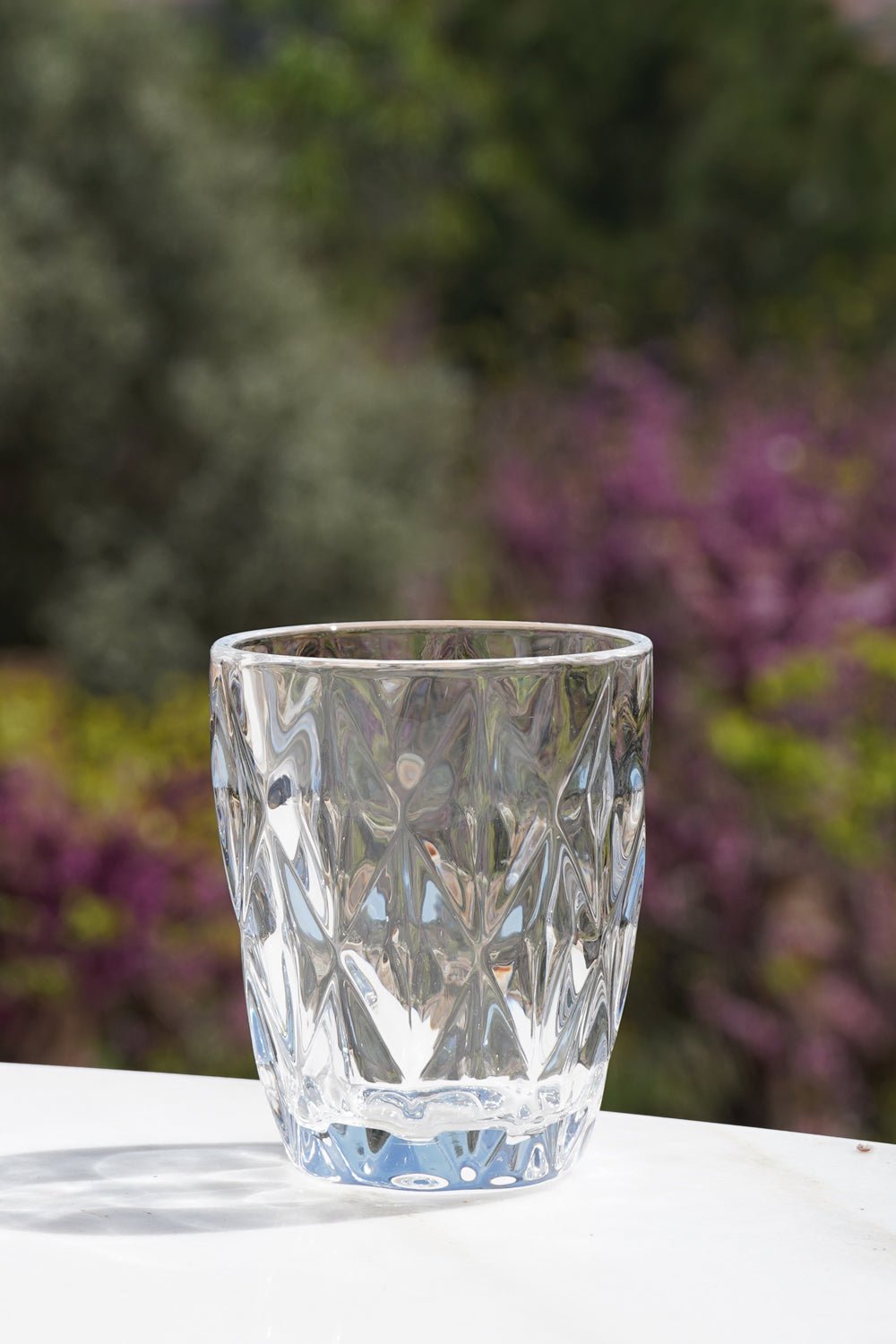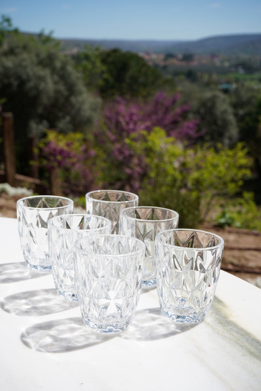 Set de seis vasos de cristal transparentes tallados con rombos, ideales y versátiles para cualquier mesa y época del año.