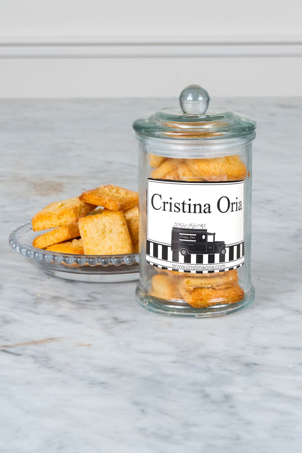 Nuestras deliciosas bretonas de mantequilla, ¡ahora con saber a queso parmesano!, presentadas en un tarro de cristal.