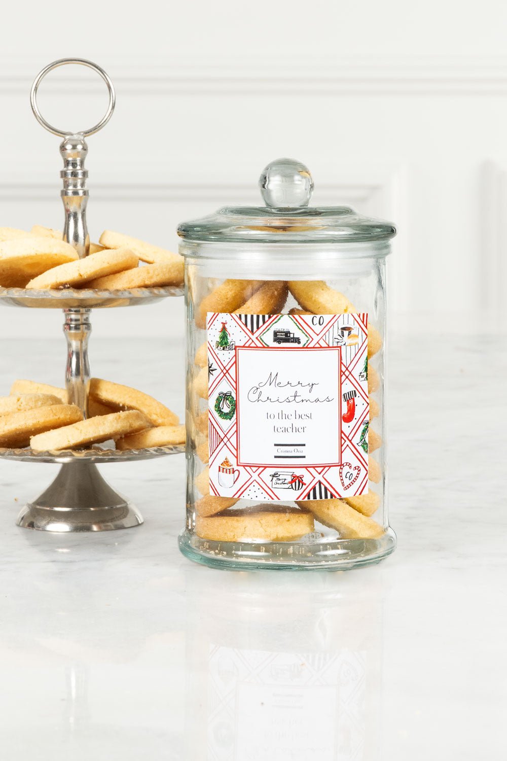 Nuestras deliciosas bretonas presentadas en un tarro de cristal con dedicatoria "Merry Christmas To The Best teacher".