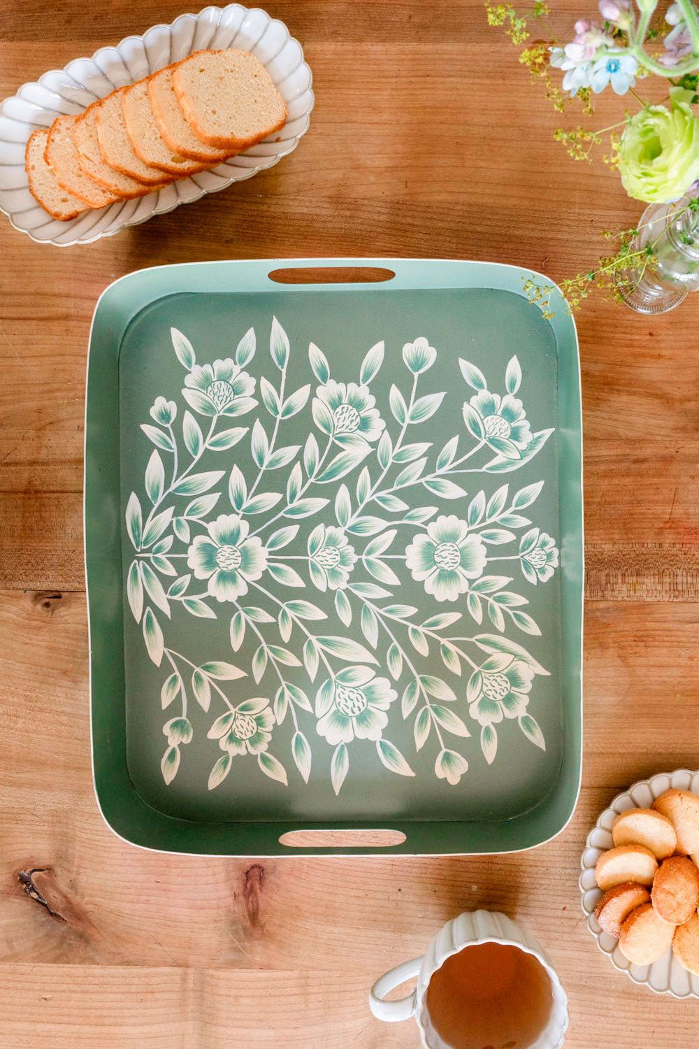 Bandeja retangular verde com flores brancas pintadas à mão, ideal para decorar e dar um toque de estilo a qualquer recanto da sua casa.