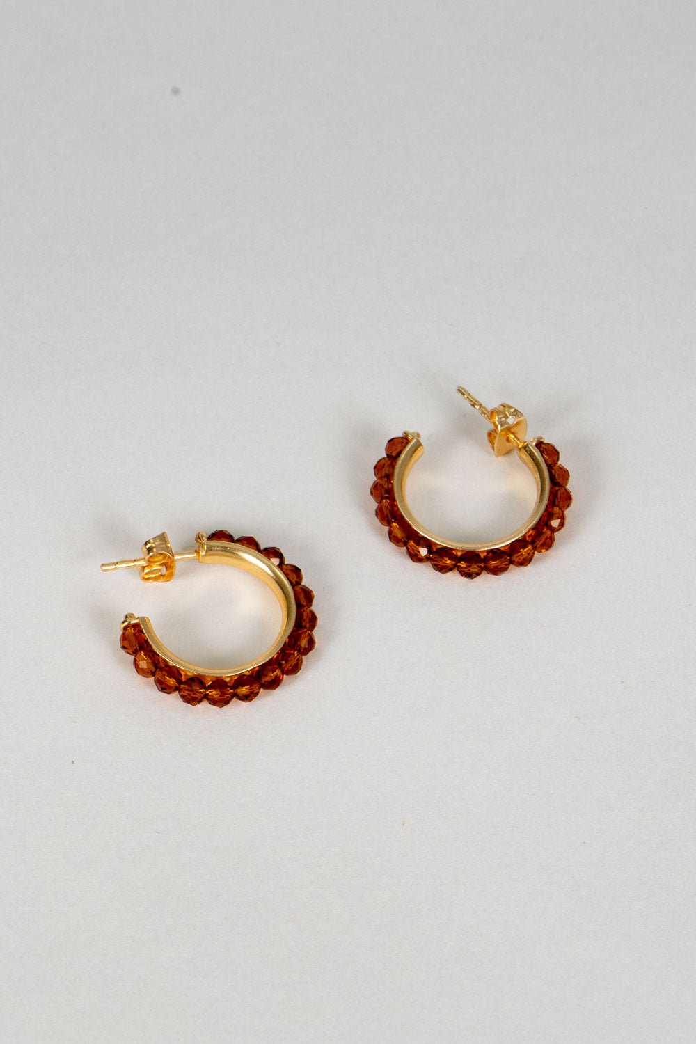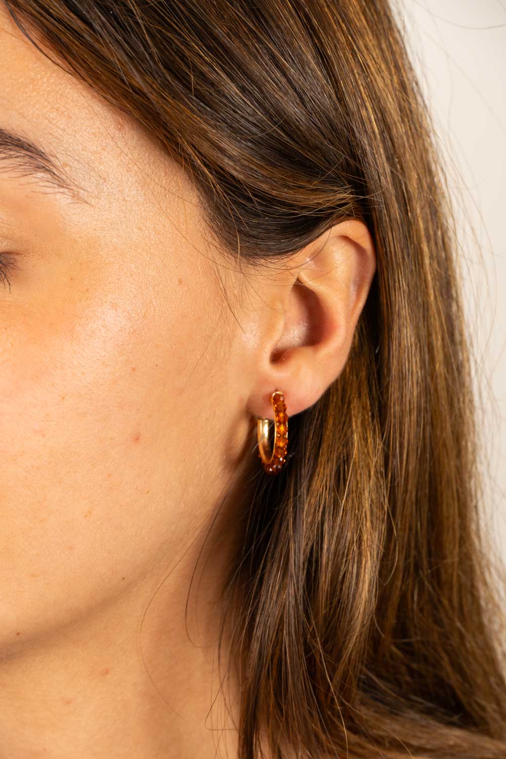 Brincos em latão banhados a ouro para um acabamento brilhante e durável, com um design de mini argola e pedras de âmbar que acrescentam um toque de brilho e calor a qualquer look. Ideais para o dia a dia ou para ocasiões especiais.