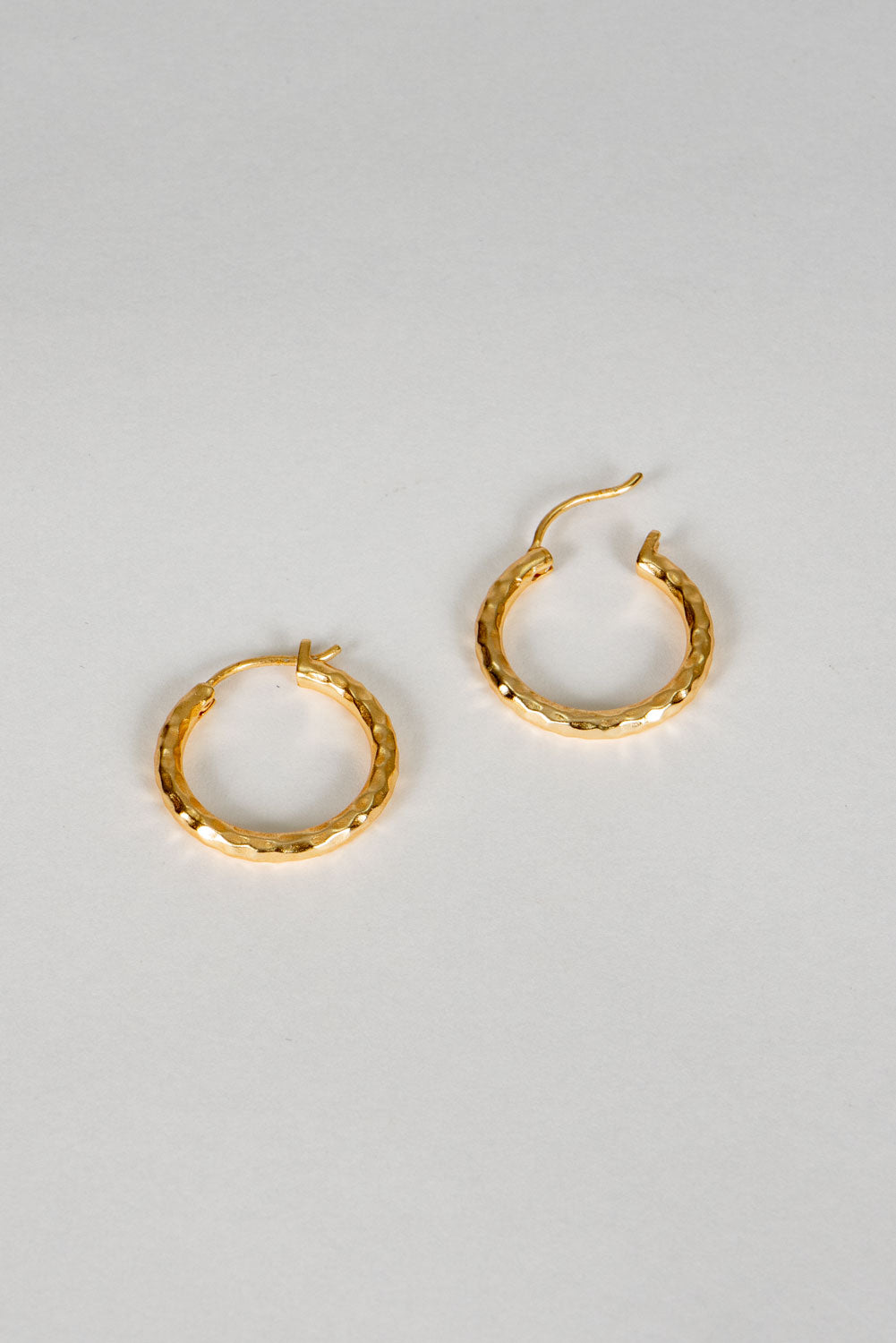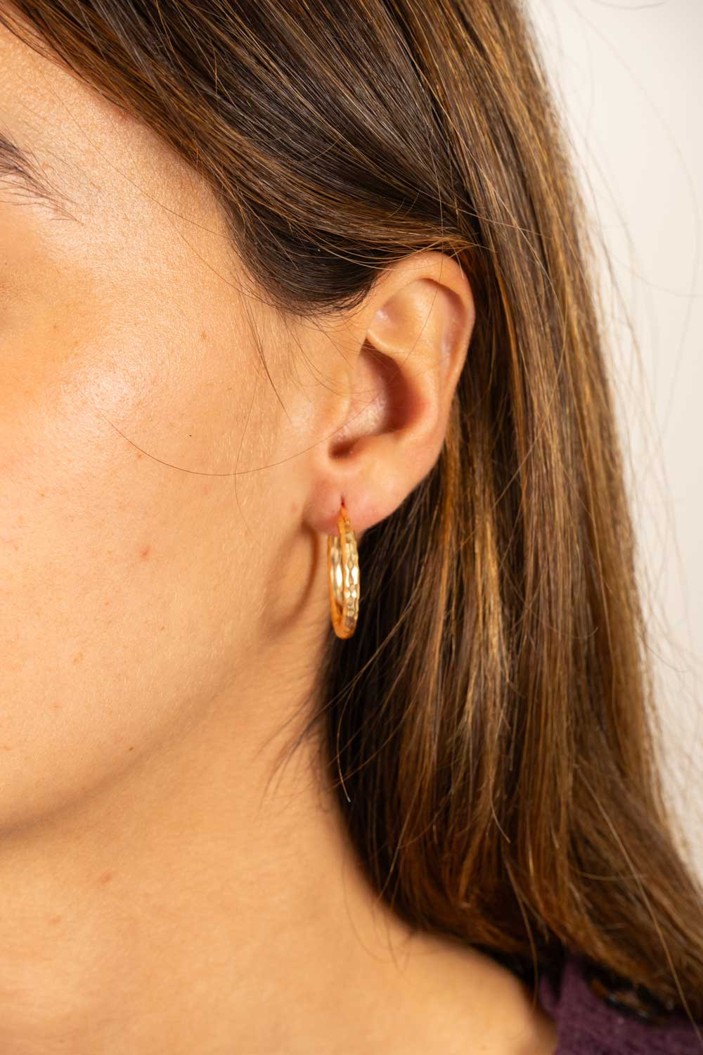Brincos em latão banhado a ouro para um acabamento brilhante e durável, com um design de argola martelada que acrescenta um toque de brilho e elegância a qualquer look. Ideais para o dia a dia ou para ocasiões especiais.