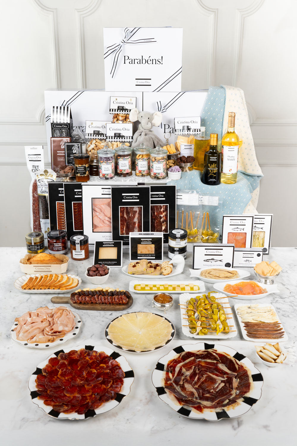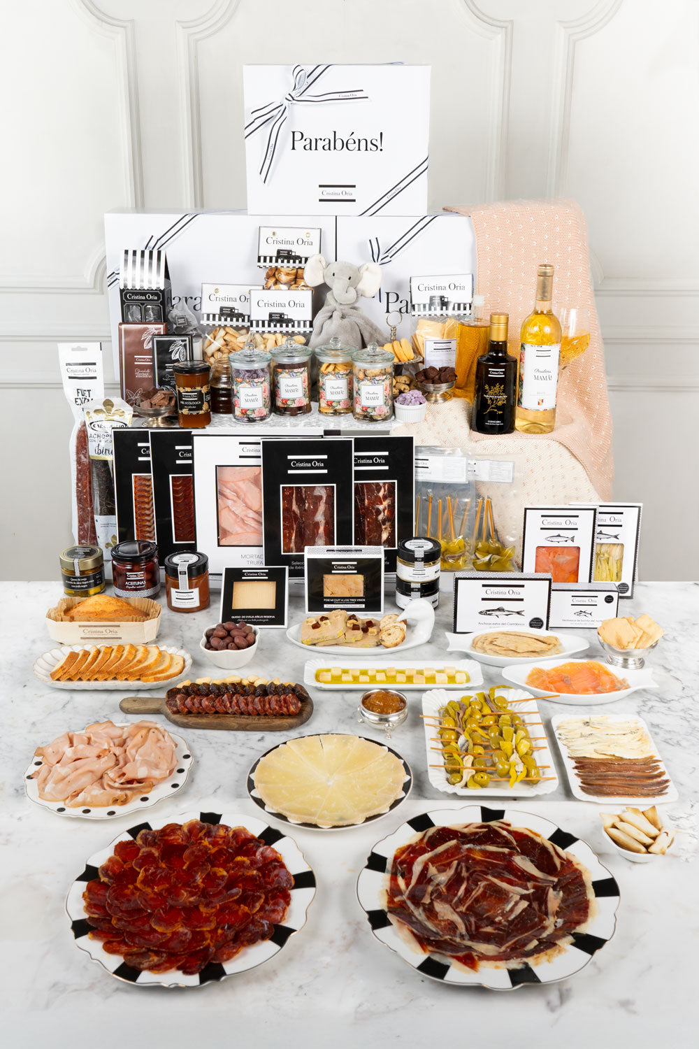 Este cabaz é a nossa opção mais completa para oferecer às recém-mamãs, pois inclui uma grande variedade dos nossos melhores produtos gourmet, além da nova mantinha reversível 100% algodão (à escolha entre rosa ou azul) e o doudou de peluche com design de elefante.