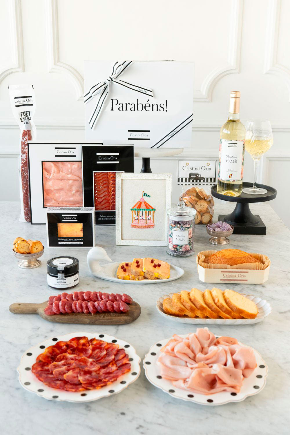 Esta caixa de oferta para novas mães inclui, para além de vários produtos gourmet para as mesmas, uma imagem bordada perfeita para decorar o quarto do recém-nascido.