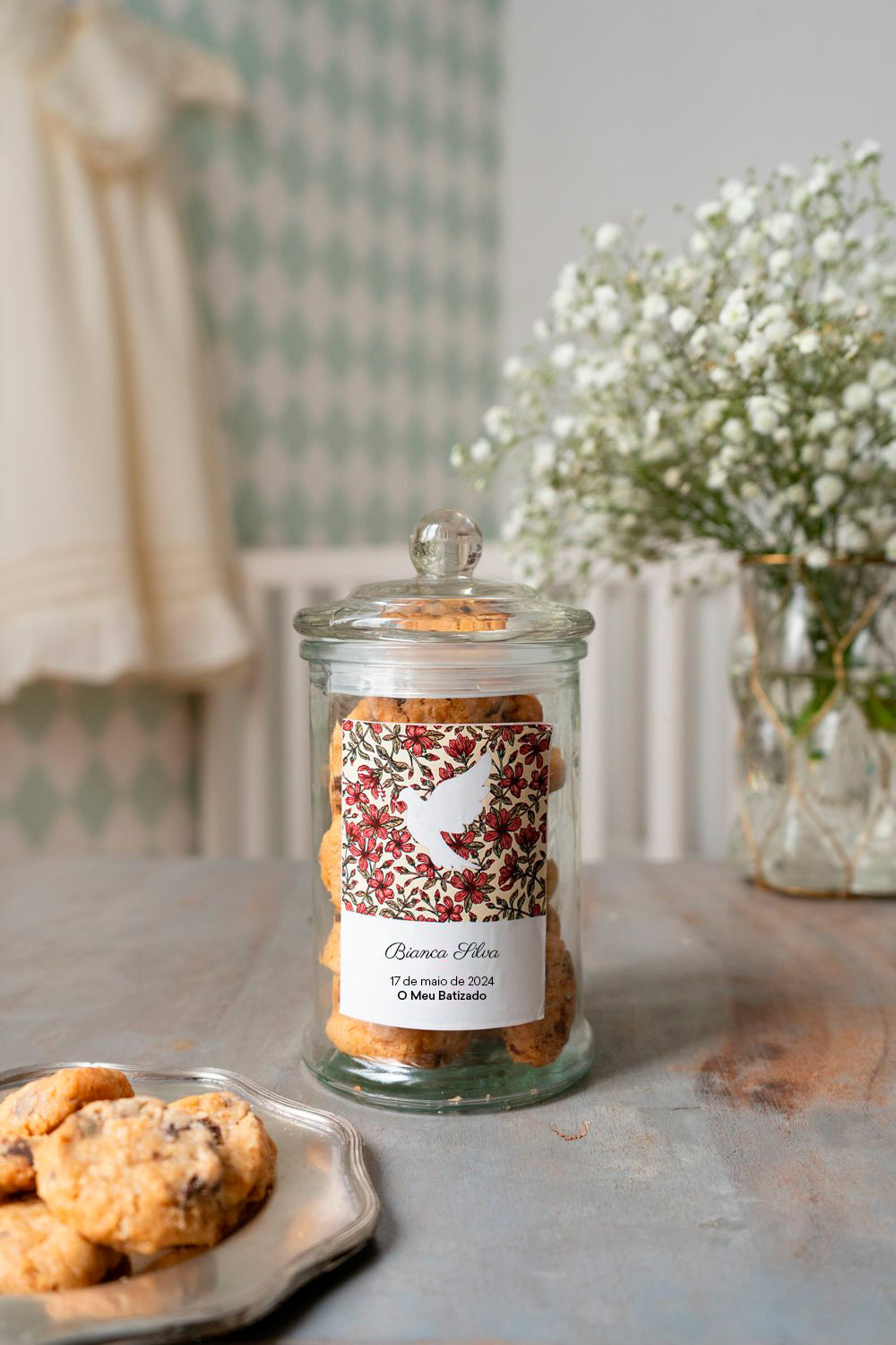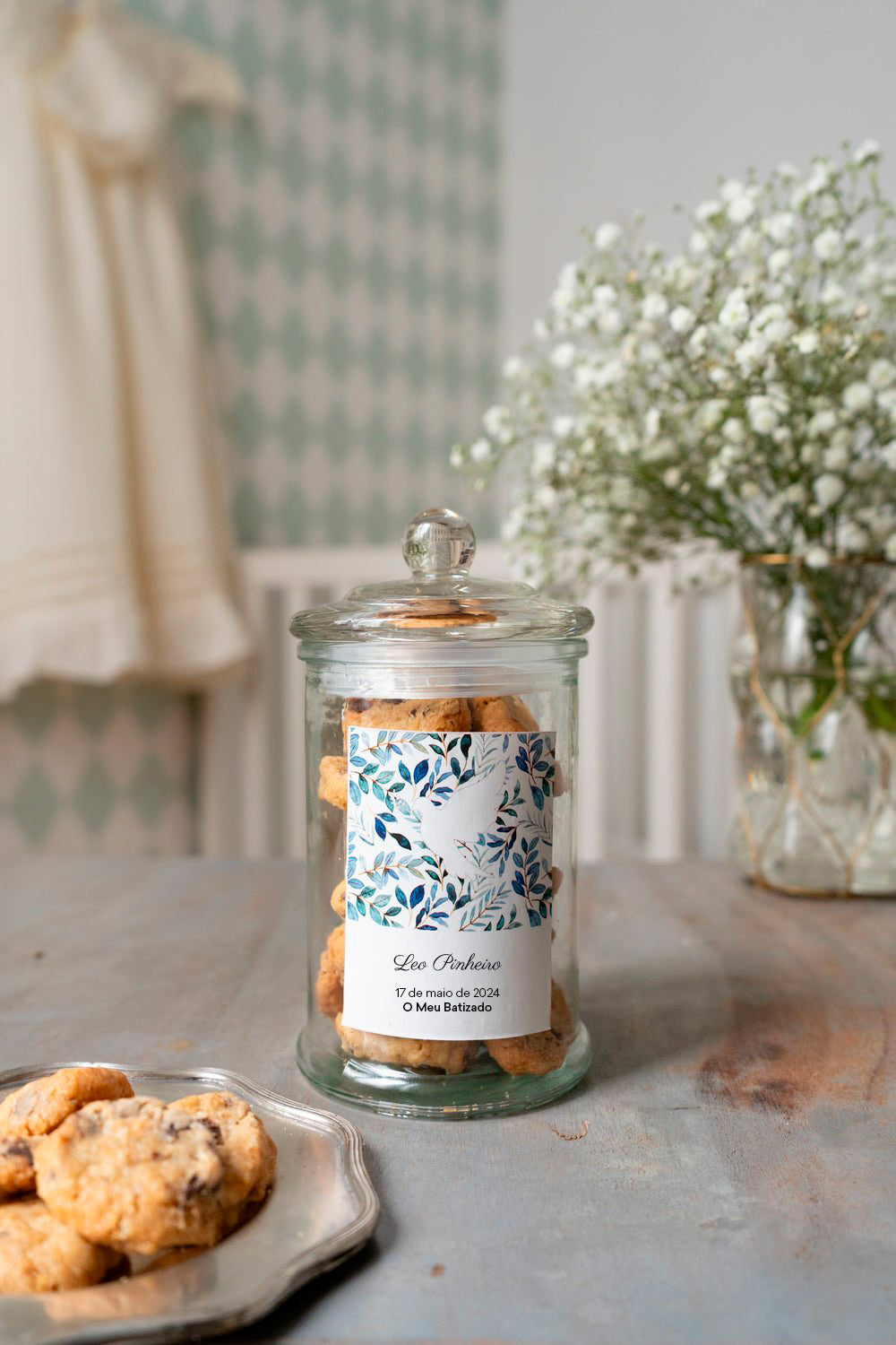 Ofereça aos seus convidados as nossas deliciosas bolachas num frasco de vidro personalizado com uma lembrança com o nome e a data do batizado.