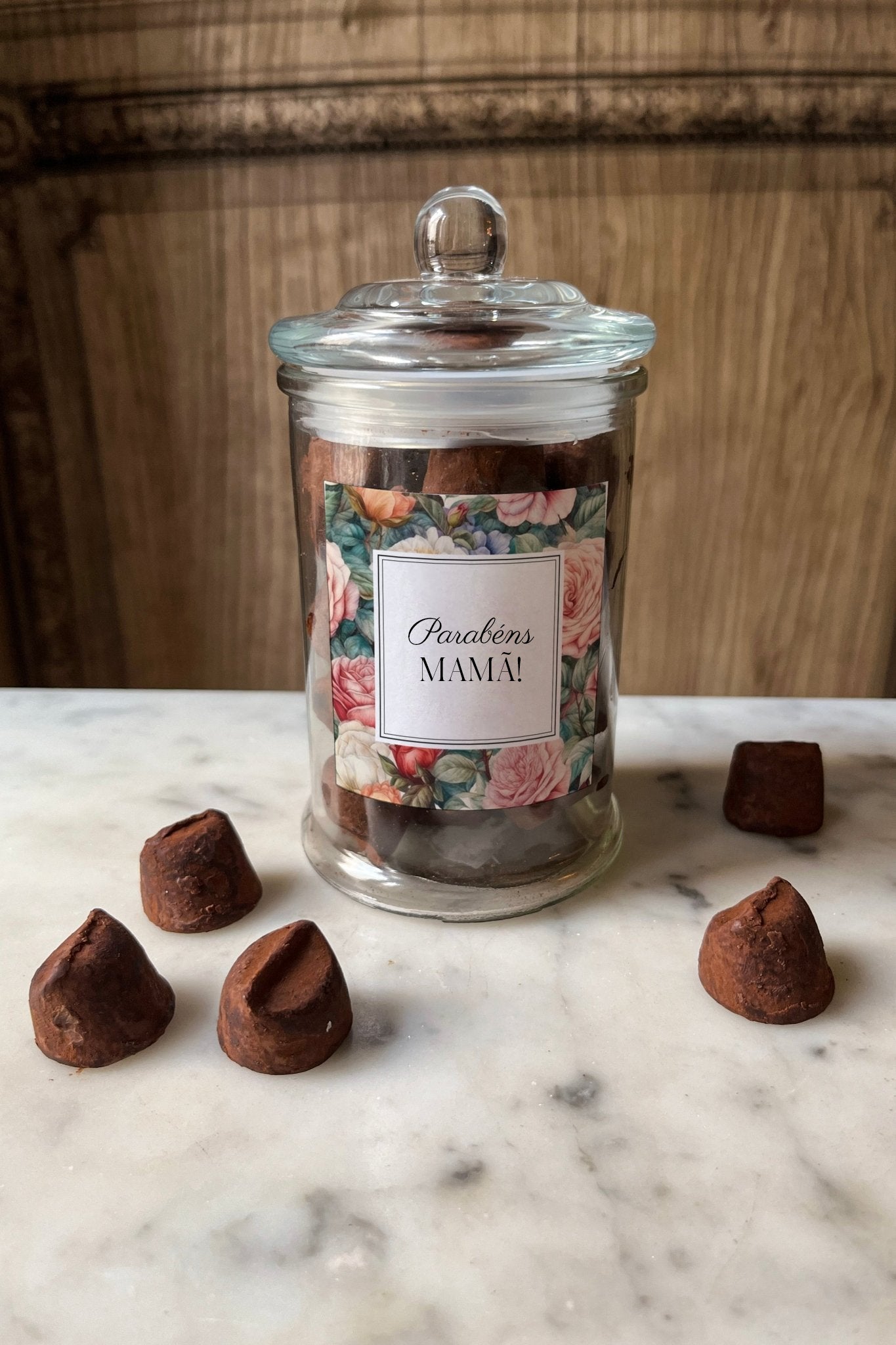 As nossas deliciosas trufas são apresentados num frasco de cristal com uma dedicatória "Parabéns mamã".